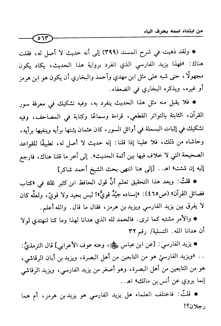 * قلتُ: وبعد هذا التحقيق تعلم أنَّ قول الحافظ ابن كثير رحمه الله في "كتاب فضائل القرآن" (ص 465): "إسناده جيّدٌ قويٌّ"! ليس بجيد ولا قويّ، ولعلَّه كان لا يفرق بين يزيد الفارسي ويزيد بن هرمز، فقال ما قال. والله أعلم.