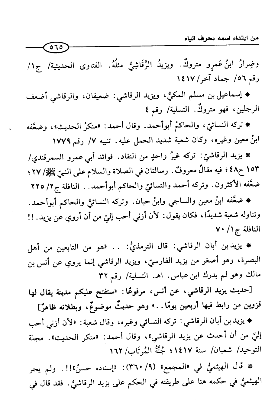 * يزيد الرقاشيّ: تركه غيرُ واحدٍ من النقاد. فوائد أبي عمرو السمرقندي / 153 ح 48؛ فيه مقالٌ معروفٌ. رسالتان في الصلاة والسلام على النبيّ -صلى الله عليه وسلم-/ 27؛ ضعَّفه الأكثرون. وتركه أحمد والنسائيّ والحاكم أبو أحمد. . النافلة ج 2/ 225