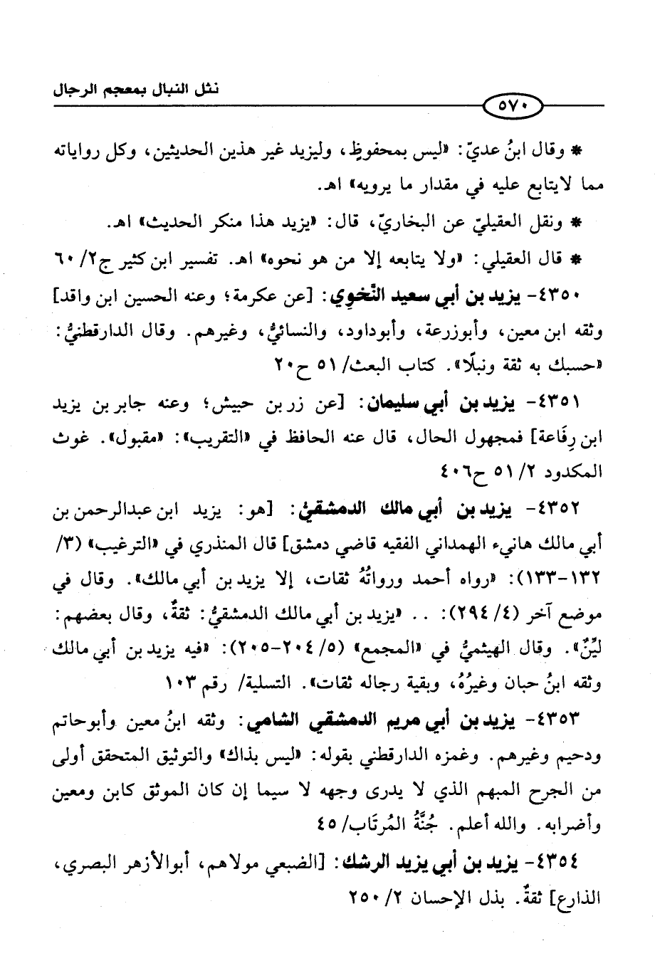 4352 - يزيد بن أبي مالك الدمشقيُّ: [هو: يزيد ابن عبد الرحمن بن أبي مالك هانيء الهمداني الفقيه قاضي دمشق] قال المنذري في "الترغيب" (3/ 132 - 133): "رواه أحمد ورواتُهُ ثقات، إلا يزيد بن أبي مالك". وقال في موضع آخر (4/ 294):. . "يزيد بن أبي مالك الدمشقيُّ: ثقةٌ، وقال بعضهم: ليِّنٌ". وقال الهيثميُّ في "المجمع" (5/ 204 - 205): "فيه يزيد بن أبي مالك وثقه ابنُ حبان وغيرُهُ، وبقية رجاله ثقات". التسلية / رقم 103