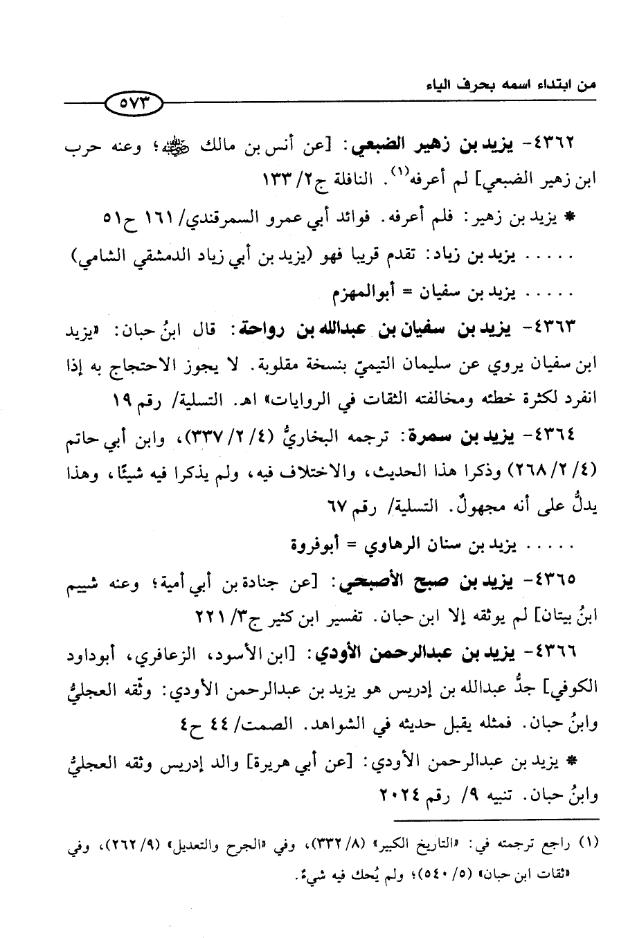 4363 - يزيد بن سفيان بن عبد الله بن رواحة: قال ابنُ حبان: "يزيد ابن سفيان يروي عن سليمان التيميّ بنسخة مقلوبة. لا يجوز الاحتجاج به إذا انفرد لكثرة خطئه ومخالفته الثقات في الروايات" اهـ. التسلية / رقم 19