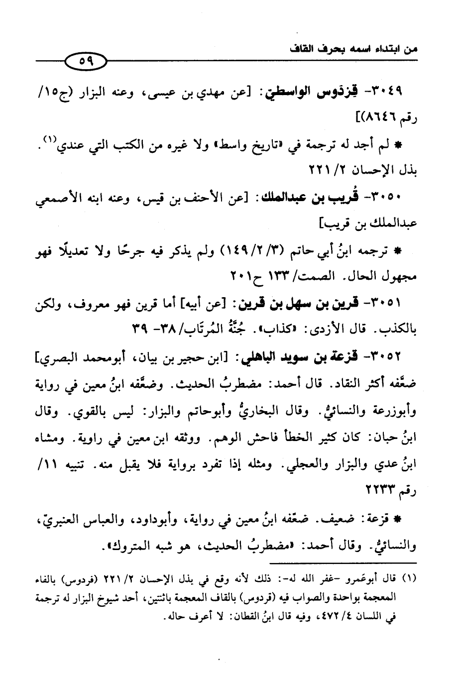 (1) قال أبو عَمرو -غفر الله له-: ذلك لأنه وقع في بذل الإحسان 2/ 221 (فردوس) بالفاء المعجمة بواحدة والصواب فيه (قردوس) بالقاف المعجمة باثنتين, أحد شيوخ البزار له ترجمة في اللسان 4/ 472 , وفيه قال ابنُ القطان: لا أعرف حاله.