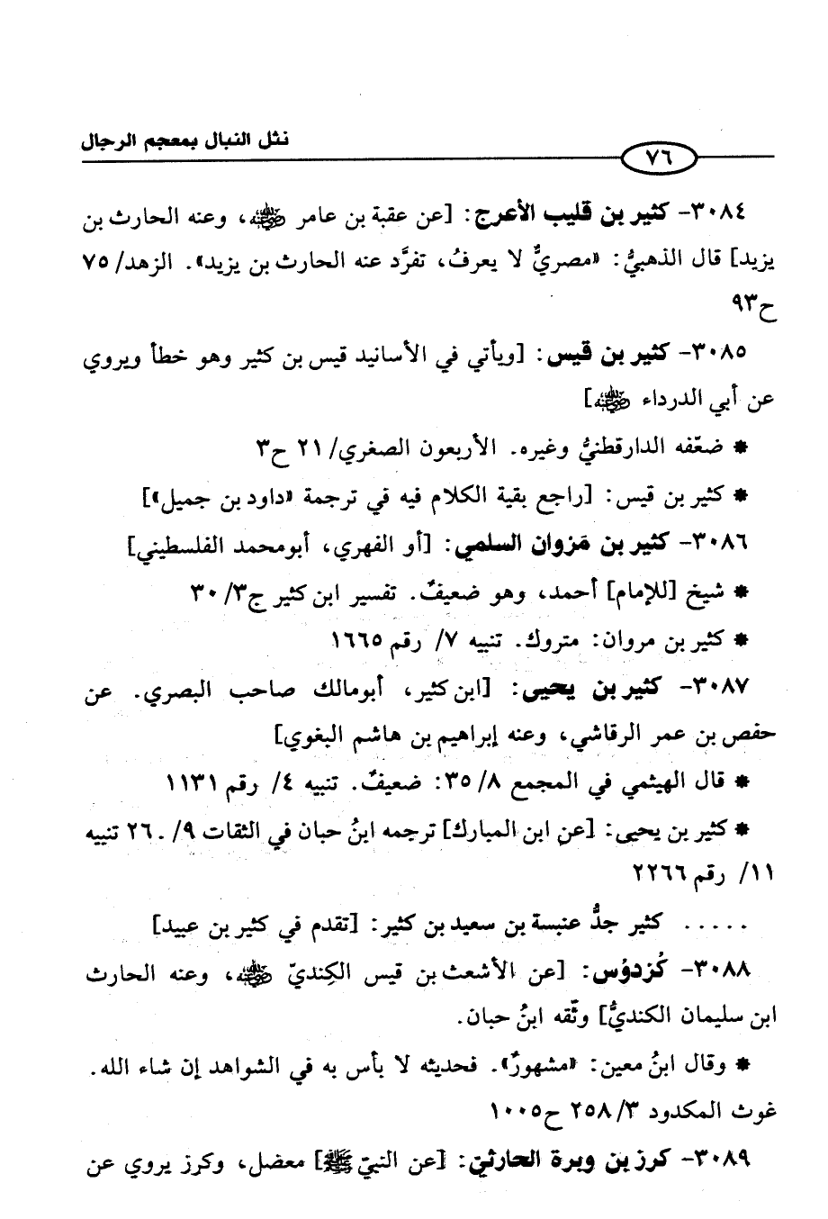 3084 - كثير بن قليب الأعرج: [عن عقبة بن عامر -رَضِيَ الله عَنْهُ- وعنه الحارث بن يزيد] قال الذهبيُّ: "مصريٌّ لا يعرفُ, تفرَّد عنه الحارث بن يزيد". الزهد / 75 ح93