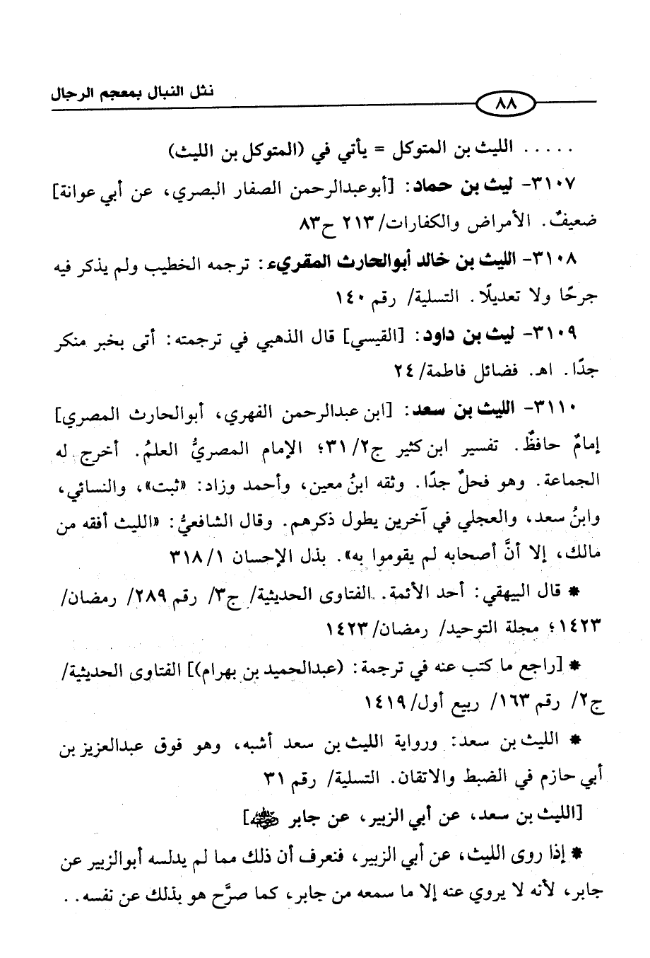 3110 - الليث بن سعد: [ابن عبد الرحمن الفهري, أبو الحارث المصري] إمامٌ حافظٌ. تفسير ابن كثير ج 2/ 31؛ الإمام المصريُّ العلمُ. أخرج له الجماعة. وهو فحلٌ جدًا. وثقه ابنُ معين, وأحمد وزاد: "ثبت" والنسائي, وابنُ سعد, والعجلي في آخرين يطول ذكرهم. وقال الشافعيُّ: "الليث أفقه من مالك, إلا أن أصحابه لم يقوموا به". بذل الإحسان 1/ 318