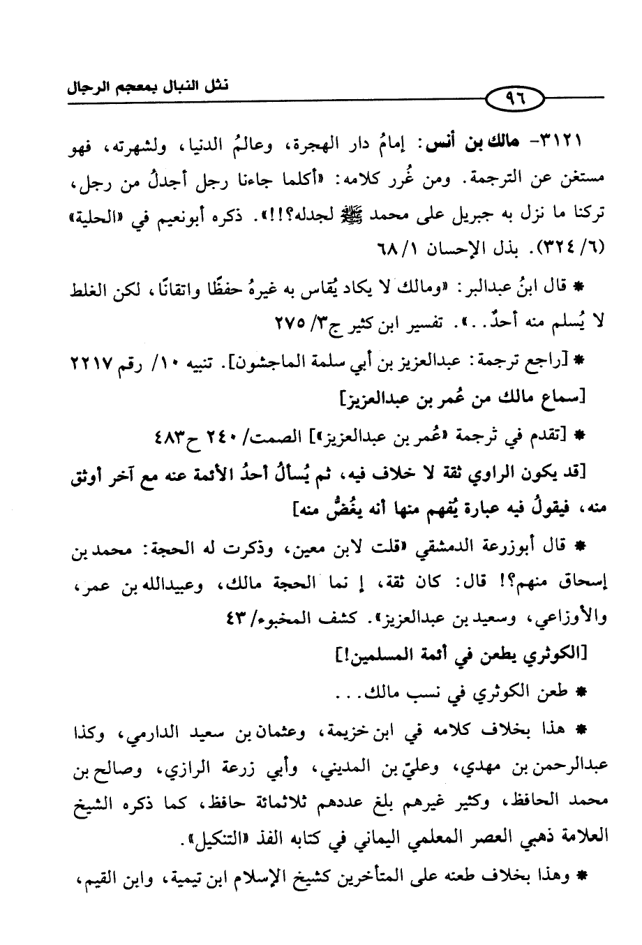 3121 - مالك بن أنس: إمامُ دار الهجرة، وعالمُ الدنيا, ولشهرته، فهو مستغن عن الترجمة. ومن غُرر كلامه: "أكلما جاءنا رجل أجدلُ من رجل، تركنا ما نزل به جبريل على محمد -صلى الله عليه وسلم- لجدله؟!! ". ذكره أبو نعيم في "الحلية" (6/ 324). بذل الإحسان1/ 68