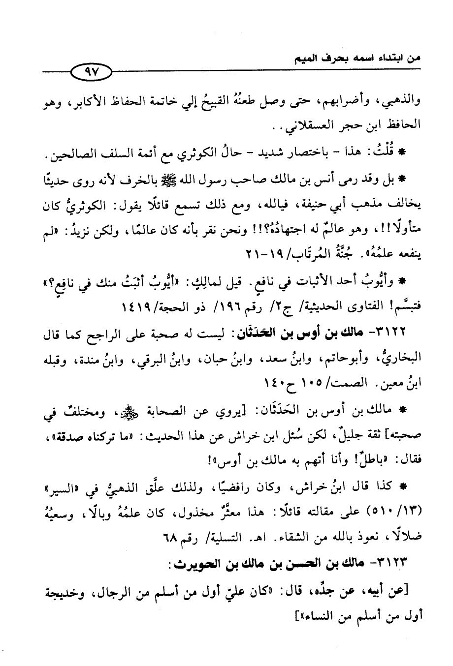 3122 - مالك بن أوس بن الحَدَثان: ليست له صحبة على الراجح كما قال البخاريُّ، وأبو حاتم، وابنُ سعد، وابنُ حبان، وابنُ البرقي، وابنُ مندة، وقبله ابنُ معين. الصمت/ 105 ح140