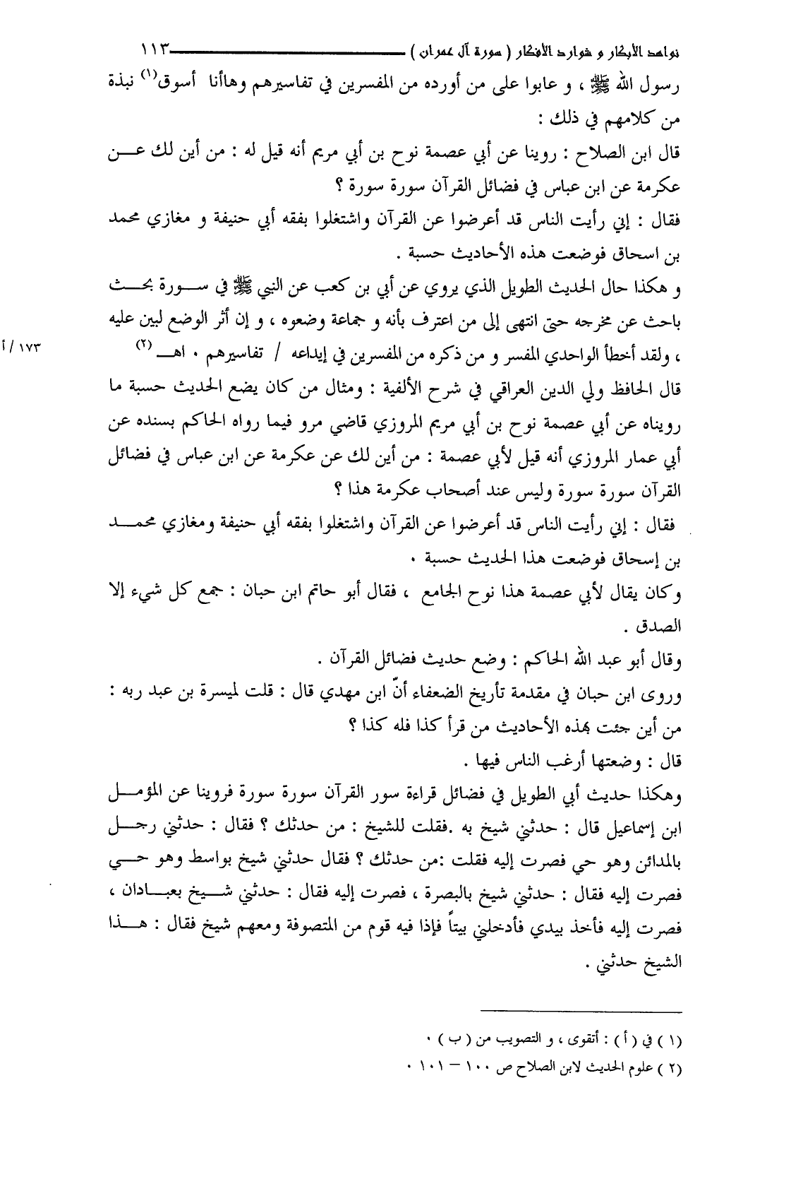 قال ابن الصلاح: روينا عن أبي عصمة نوح بن أبي مريم أنه قيل له: من أين لك عن عكرمة عن ابن عباس في فضائل القرآن سورة سورة؟