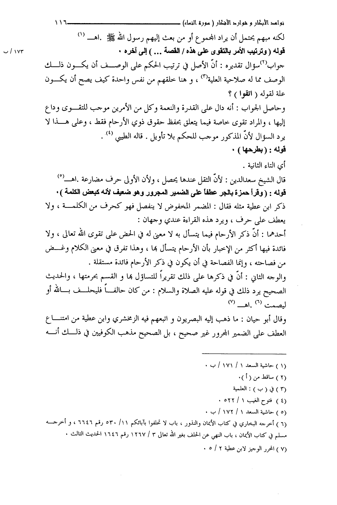 وحاصل الجواب: أنه دال على القدرة والنعمة وكل من الأمرين موجب للتقوى وداع إليها، والمراد تقوى خاصة فيما يتعلق بحفظ حقوق ذوي الأرحام فقط، وعلى هذا لا يرد السؤال لأنَّ المذكور موجب للحكم بلا تأويل. قاله الطَّيبي.