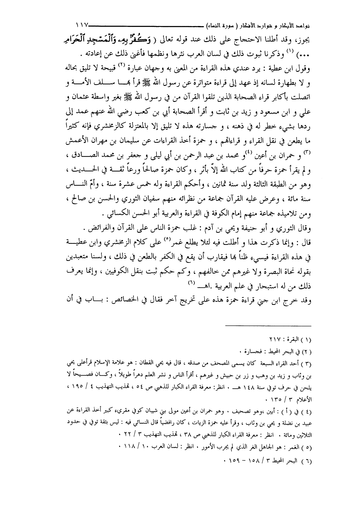 وقال الثوري وأبو حنيفة ويحيى بن آدم: غلب حمزة الناس على القرآن والفرائض. قال: وإنما ذكرت هذا وأطلت فيه لئلا يطلع عمر على كلام الزمخشري وابن عطية في هذه القراءة فيسيء ظناً بها فيقارب أن يقع في الكفر بالطعن في ذلك، ولسنا متعبدين بقوله نحاة البصرة ولا غيرهم ممن خالفهم، وكم حكم ثبت بنقل الكوفيين، وإنما يعرف ذلك من له استبحار في علم العربية. اهـ