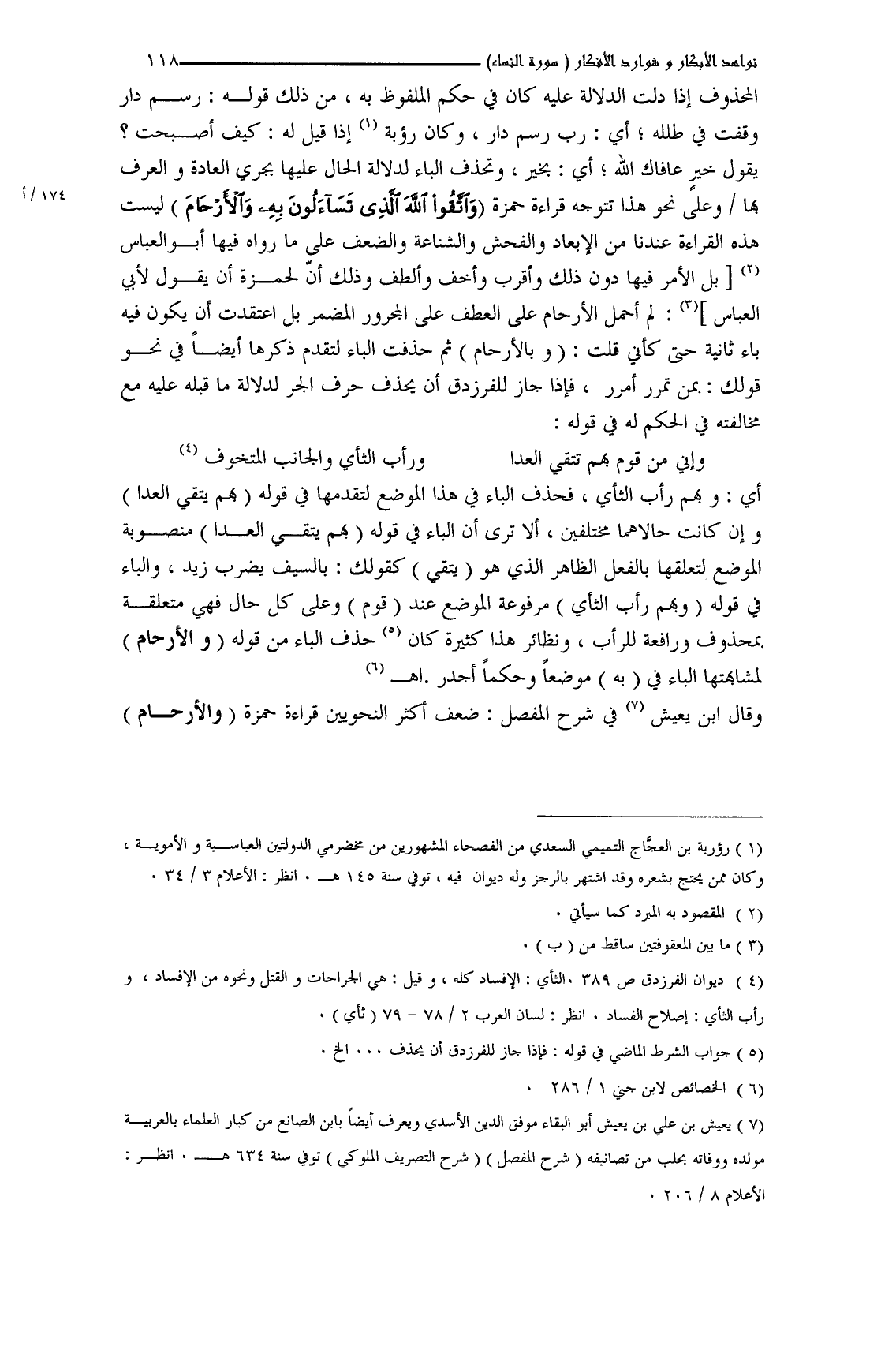 المحذوف إذا دلت الدلالة عليه كان في حكم الملفوظ به، من ذلك قوله: رسم دار وقفت في طلله؛ أي: رب رسم دار، وكان رؤبة إذا قيل له: كيف أصبحت؟ يقول خيرٍ عافاك الله؛ أي: بخير، وتحذف الباء لدلالة الحال عليها بجري العادة والعرف بها وعلى نحو هذا تتوجه قراءة حمزة (وَاتَّقُوا اللهَ الَّذِي تَسَاءَلُونَ بِهِ وَالْأَرْحَامِ) ليست هذه القراءة عندنا من الإبعاد والفحش والشناعة والضعف على ما رواه فيها أبو العباس [بل الأمر فيها دون ذلك وأقرب وأخف وألطف وذلك أنَّ لحمزة أن يقول لأبي العباس]: لم أحمل الأرحام على العطف على المجرور المضمر بل اعتقدت أن يكون فيه باء ثانية حتى كأني قلت: (وبالأرحام) ثم حذفت الباء لتقدم ذكرها أيضاً في نحو قولك: بمن تمرر أمرر، فإذا جاز للفرزدق أن يحذف حرف الجر لدلالة ما قبله عليه مع مخالفته في الحكم له في قوله: