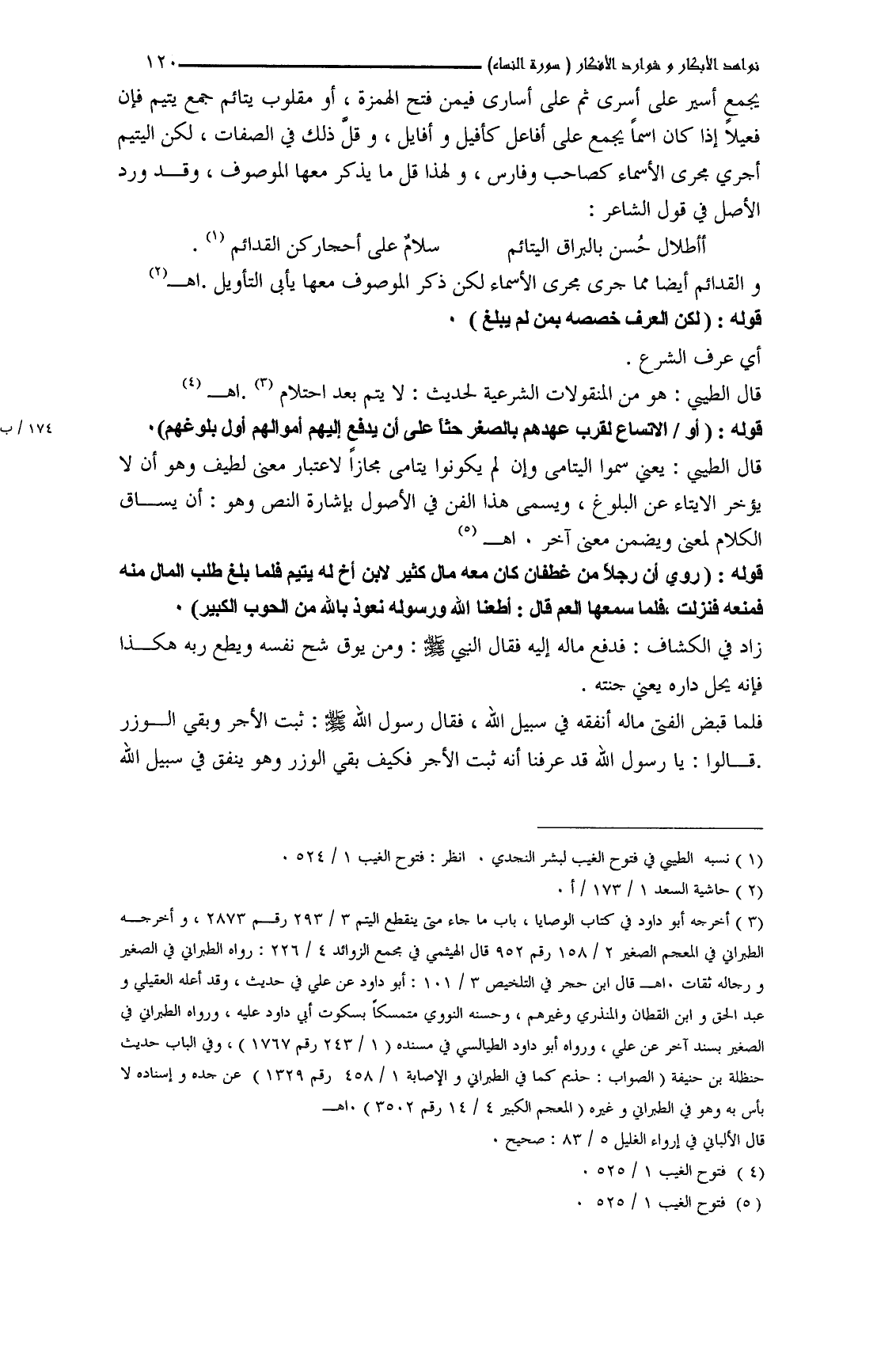 قوله: (روي أن رجلاً من غطفان كان معه مال كثير لابن أخ له يتيم فلما بلغ طلب المال منه فمنعه فنزلت، فلما سمعها العم قال: أطعنا الله ورسوله نعوذ بالله من الحوب الكبير).