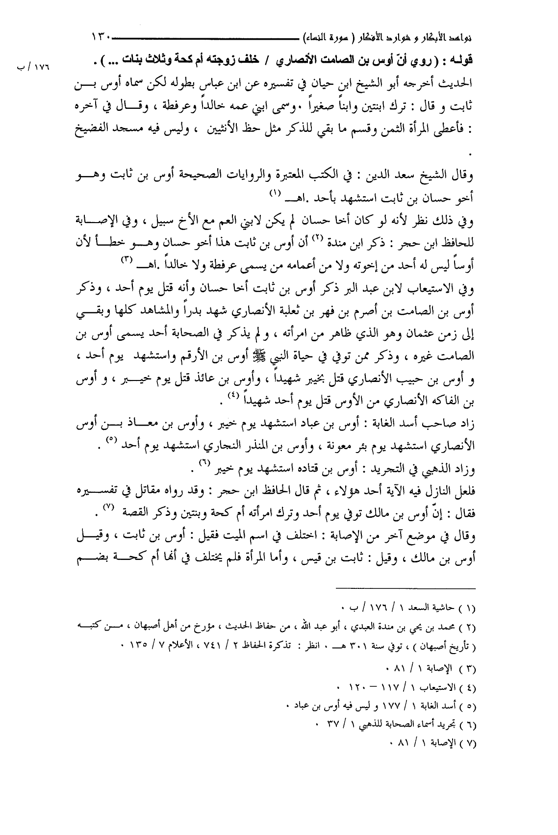 وقال الشيخ سعد الدين: في الكتب المعتبرة والروايات الصحيحة أوس بن ثابت وهو أخو حسان بن ثابت استشهد بأُحد. اهـ