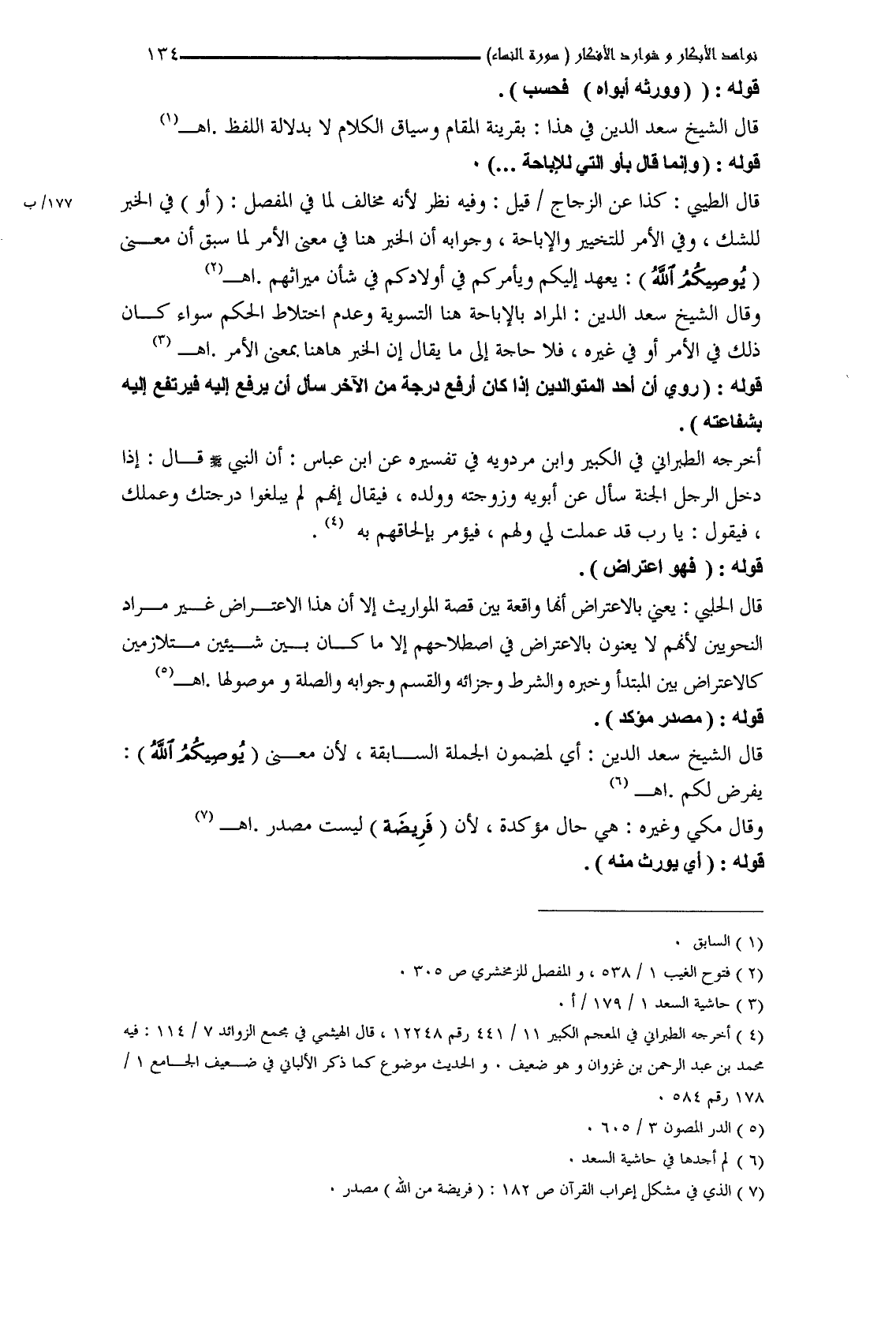 قال الحلبي: يعني بالاعتراض أنَّها واقعة بين قصة المواريث إلا أن هذا الاعتراض غير مراد النحويين لأنهم لا يعنون بالاعتراض في اصطلاحهم إلا ما كان بين شيئين متلازمين كالاعتراض بين المبتدأ وخبره والشرط وجزائه والقسم وجوابه والصلة وموصولها. اهـ