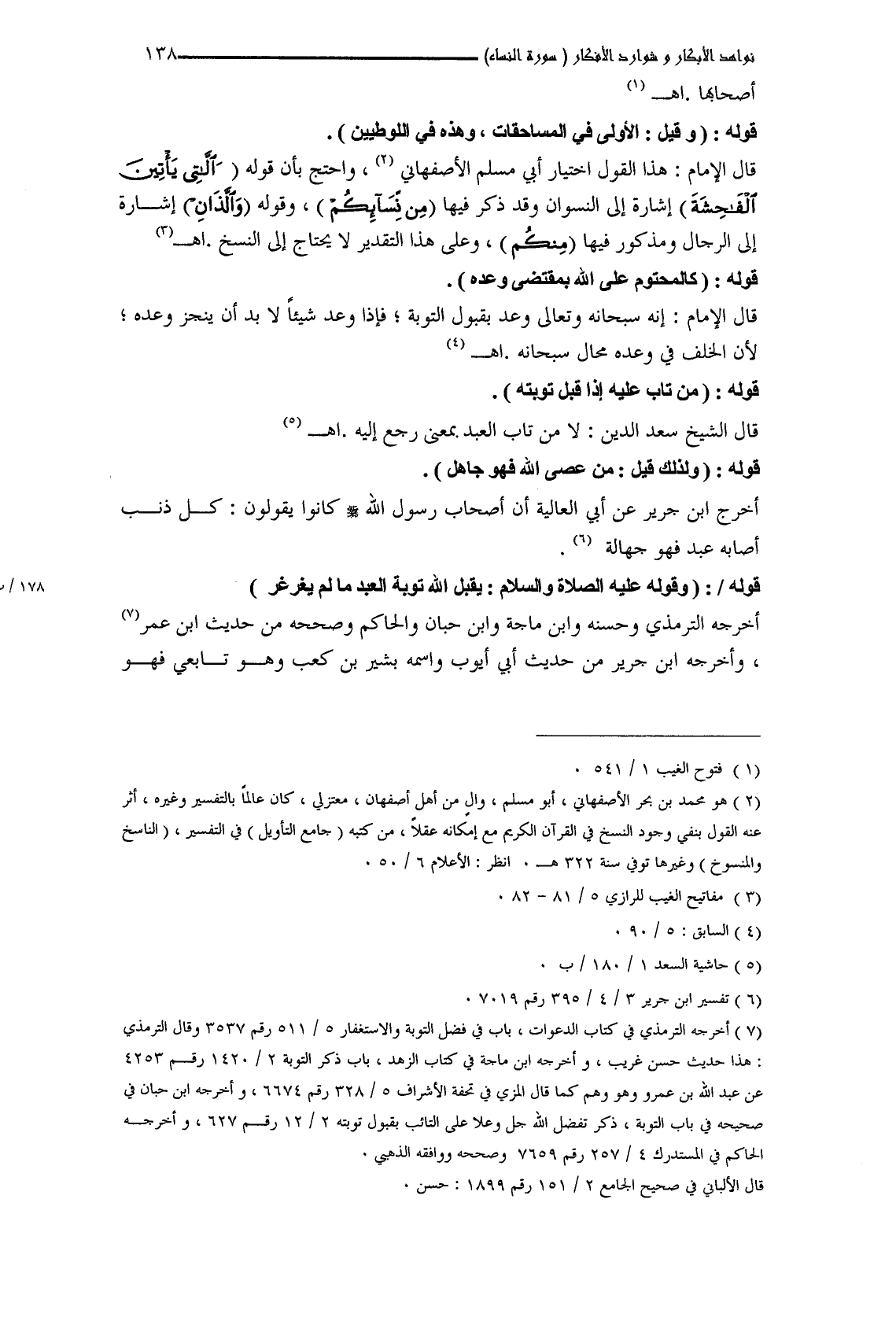 قال الإمام: هذا القول اختيار أبي مسلم الأصفهاني، واحتج بأن قوله (وَاللاّتِي يَأْتِينَ الْفَاحِشَةَ) إشارة إلى النسوان وقد ذكر فيها (مِنْ نِسَائِكُمْ)، وقوله (وَاللَّذَانِ) إشارة إلى الرجال ومذكور فيها (مِنْكُمْ)، وعلى هذا التقدير لا يحتاج إلى النسخ. اهـ