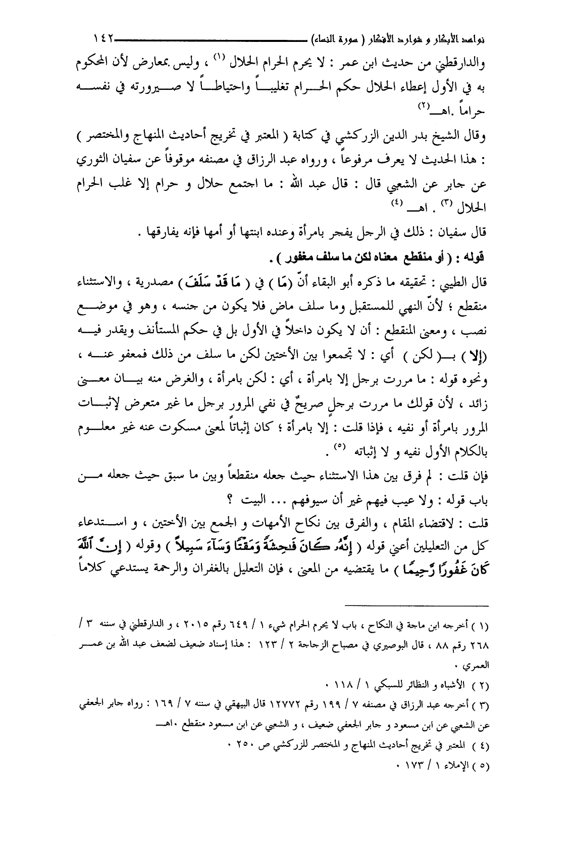 قال الطَّيبي: تحقيقه ما ذكره أبو البقاء أنَّ (ما) في (مَا قَد سَلَفَ) مصدرية، والاستثناء منقطع؛ لأنَّ النهي للمستقبل وما سلف ماض فلا يكون من جنسه، وهو في موضع نصب، ومعنى المنقطع: أن لا يكون داخلاً في الأول بل في حكم المستأنف ويقدر فيه (إِلا) بـ (لكن) أي: لا تجمعوا بين الأختين لكن ما سلف من ذلك فمعفو عنه، ونحوه قوله: ما مررت برجل إلا بامرأة، أي: لكن بامرأة، والغرض منه بيان معنى زائد، لأن قولك ما مررت برجلٍ صريحٌ في نفي المرور برجل ما غير متعرض لإثبات المرور بامرأة أو نفيه، فإذا قلت: إلا بامرأة؛ كان إثباتاً لمعنى مسكوت عنه غير معلوم بالكلام الأول نفيه ولا إثباته.