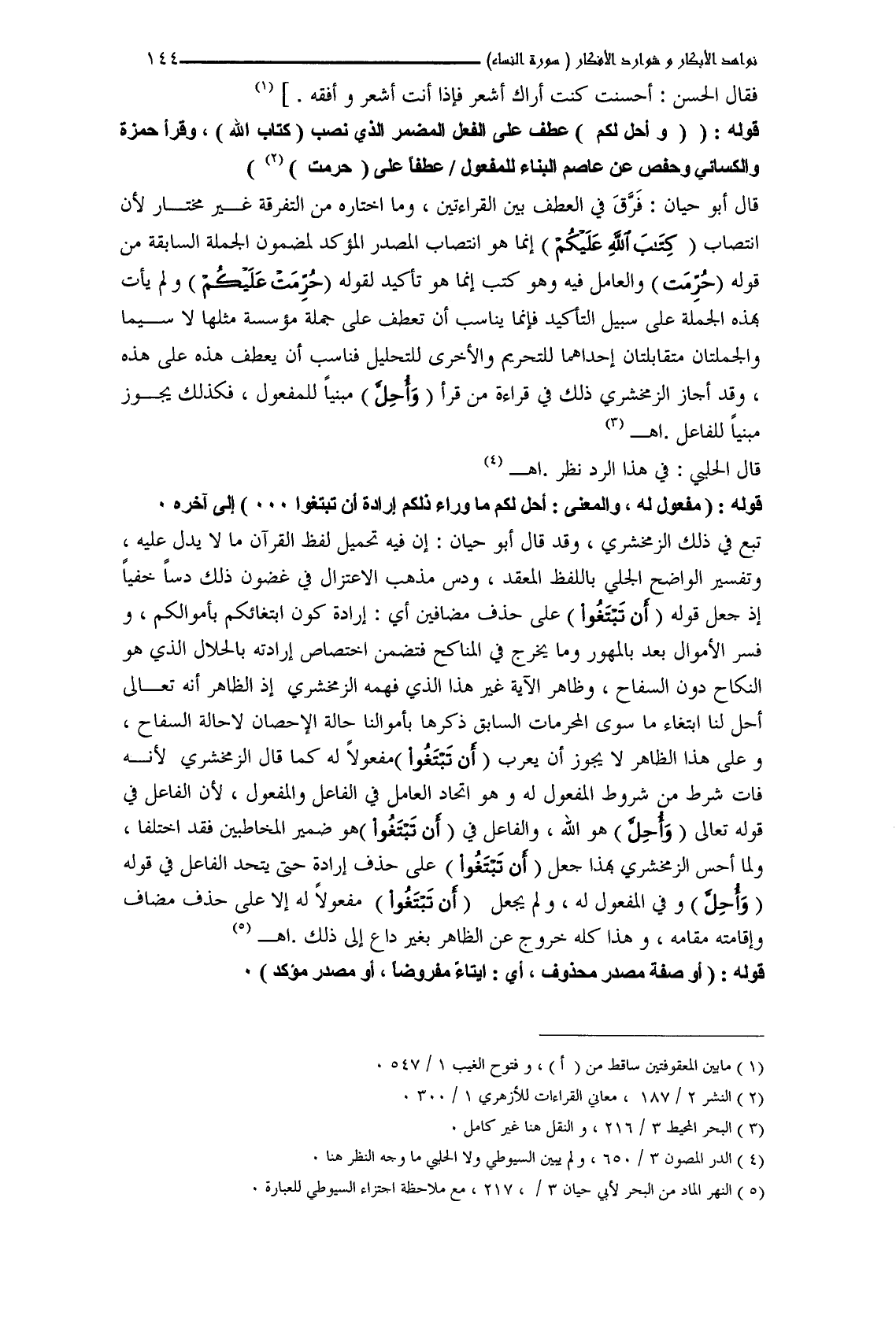 تبع في ذلك الزمخشري، وقد قال أبو حيان: إن فيه تحميل لفظ القرآن ما لا يدل عليه، وتفسير الواضح الجلي باللفظ المعقد، ودس مذهب الاعتزال في غضون ذلك دساً خفياً إذ جعل قوله (أَنْ تَبْتَغُوا) على حذف مضافين أي: إرادة كون ابتغائكم بأموالكم، وفسر الأموال بعد بالمهور وما يخرج في المناكح فتضمن اختصاص إرادته بالحلال الذي هو النكاح دون السفاح، وظاهر الآية غير هذا الذي فهمه الزمخشري إذ الظاهر أنه تعالى أحل لنا ابتغاء ما سوى المحرمات السابق ذكرها بأموالنا حالة الإحصان لاحالة السفاح، وعلى هذا الظاهر لا يجوز أن يعرب (أَنْ تَبْتَغُوا) مفعولاً له كما قال الزمخشري لأنه فات شرط من شروط المفعول له وهو اتحاد العامل في الفاعل والمفعول، لأن الفاعل في قوله تعالى (وَأُحِلَّ) هو الله، والفاعل في (أَنْ تَبْتَغُوا) هو ضمير المخاطبين فقد اختلفا، ولما أحس الزمخشري بهذا جعل (أَنْ تَبْتَغُوا) على حذف إرادة حتى يتحد الفاعل في قوله (وَأُحِلَّ) وفي المفعول له، ولم يجعل (أَنْ تَبْتَغُوا) مفعولاً له إلا على حذف مضاف وإقامته مقامه، وهذا كله خروج عن الظاهر بغير داع إلى ذلك. اهـ