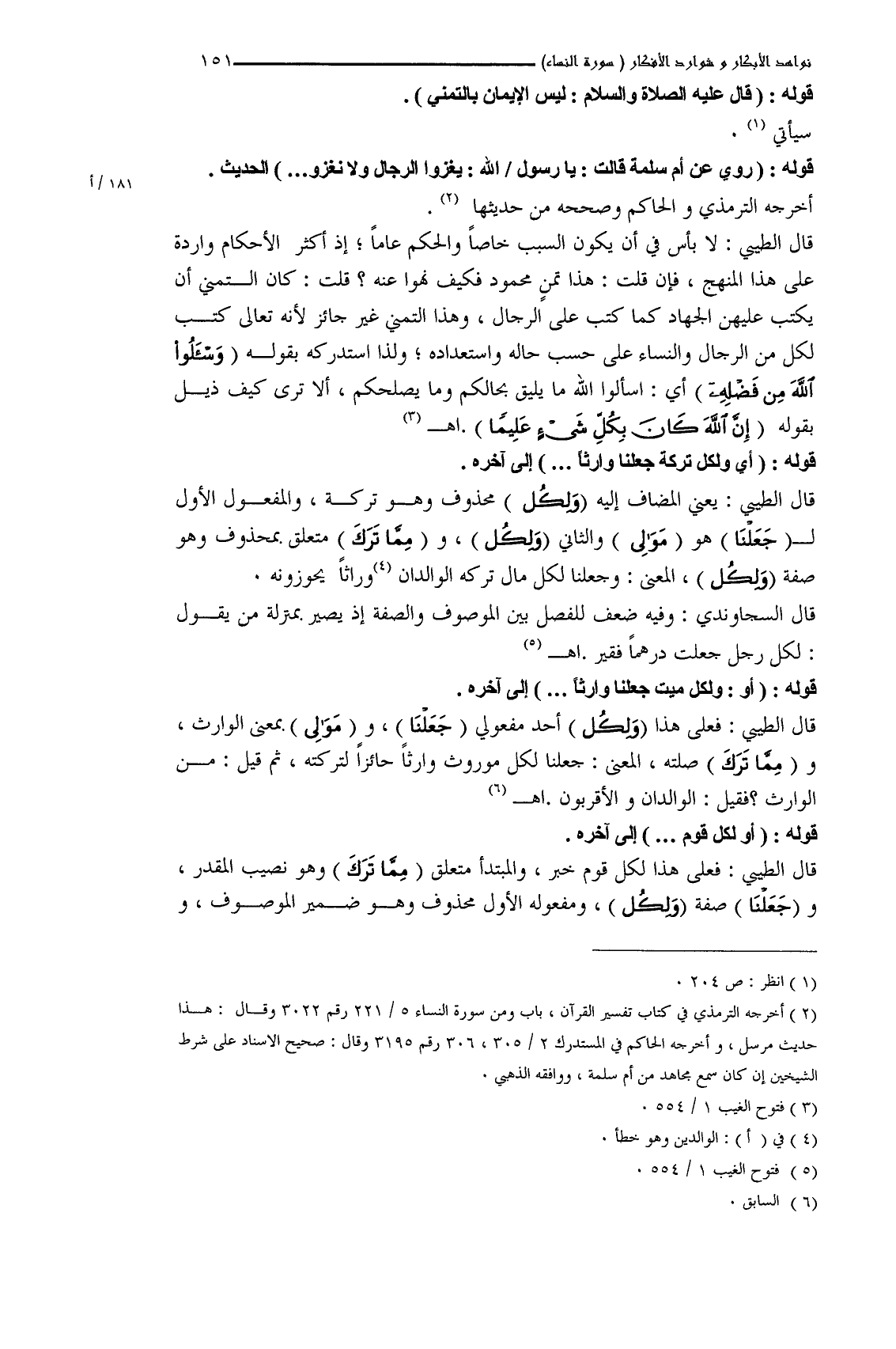 قال الطَّيبي: لا بأس في أن يكون السبب خاصاً والحكم عاماً؛ إذ أكثر الأحكام واردة على هذا المنهج، فإن قلت: هذا تمنٍ محمود فكيف نهوا عنه؟ قلت: كان التمني أن يكتب عليهن الجهاد كما كتب على الرجال، وهذا التمني غير جائز لأنه تعالى كتب لكل من الرجال والنساء على حسب حاله واستعداده؛ ولذا استدركه بقوله (وَاسْأَلُوا اللهَ مِنْ فَضْلِهِ) أي: اسألوا الله ما يليق بحالكم وما يصلحكم، ألا ترى كيفى ذيل بقوله (إِنَّ اللهَ كَانَ بِكُلِّ شَيْءٍ عَلِيمًا). اهـ