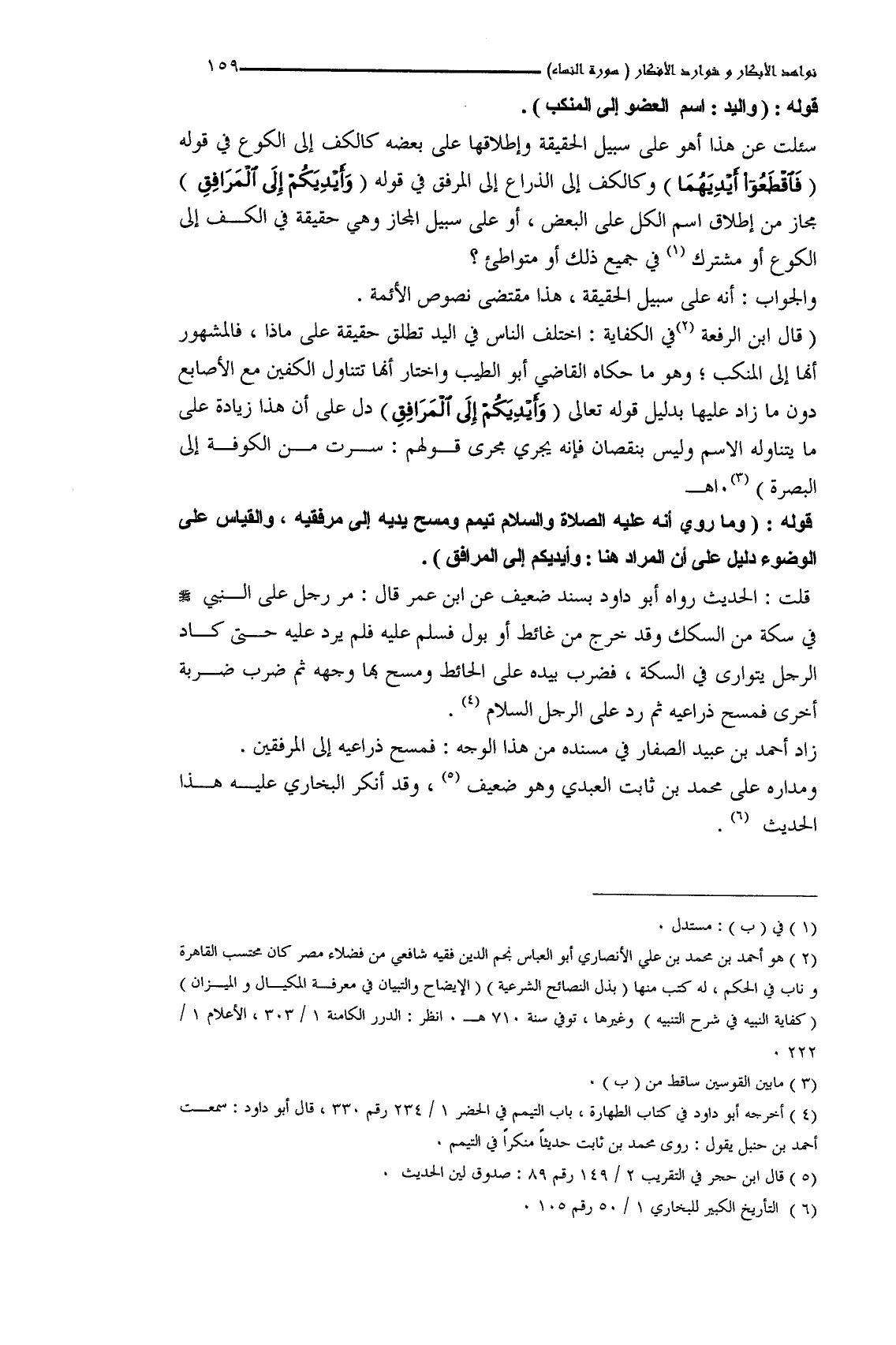ً (قال ابن الرفعة في الكفاية: اختلف الناس في اليد تطلق حقيقة على ماذا، فالمشهور أنها إلى المنكب؛ وهو ما حكاه القاضي أبو الطيب واختار أنَّها تتناول الكفين مع الأصابع دون ما زاد عليها بدليل قوله تعالى (وَأَيْدِيَكُمْ إِلَى الْمَرَافِقِ) دل على أن هذا زيادة على ما يتناوله الاسم وليس بنقصان فإنه يجري مجرى قولهم: سرت من الكوفة إلى البصرة). اهـ