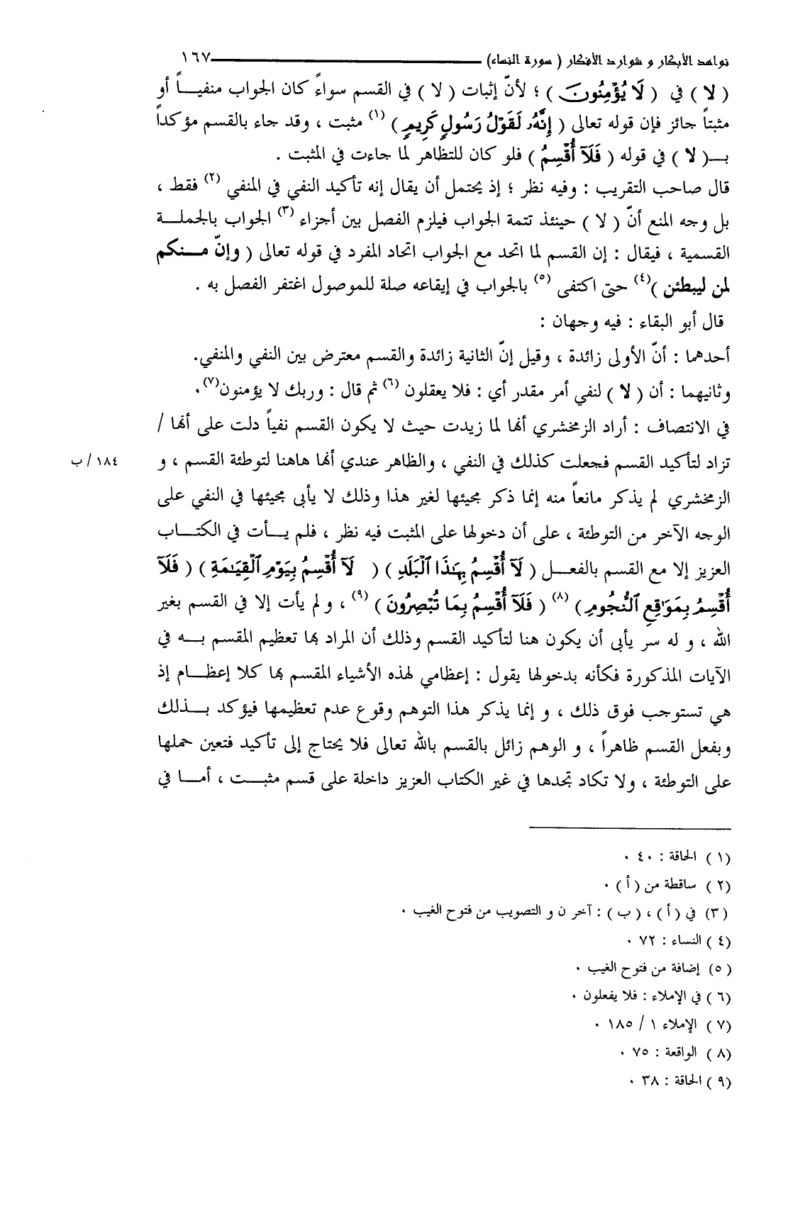 قال صاحب التقريب: وفيه نظر؛ إذ يحتمل أن يقال إنه تأكيد النفي في المنفي فقط، بل وجه المنع أنَّ (لا) حينئذ تتمة الجواب فيلزم الفصل بين أجزاء الجواب بالجملة القسمية، فيقال: إن القسم لما اتحد مع الجواب اتحاد المفرد في قوله تعالى (وَإِنَّ مِنْكُمْ لَمَنْ لَيُبَطِّئَنَّ) حتى اكتفى بالجواب في إيقاعه صلة للموصول اغتفر الفصل به.