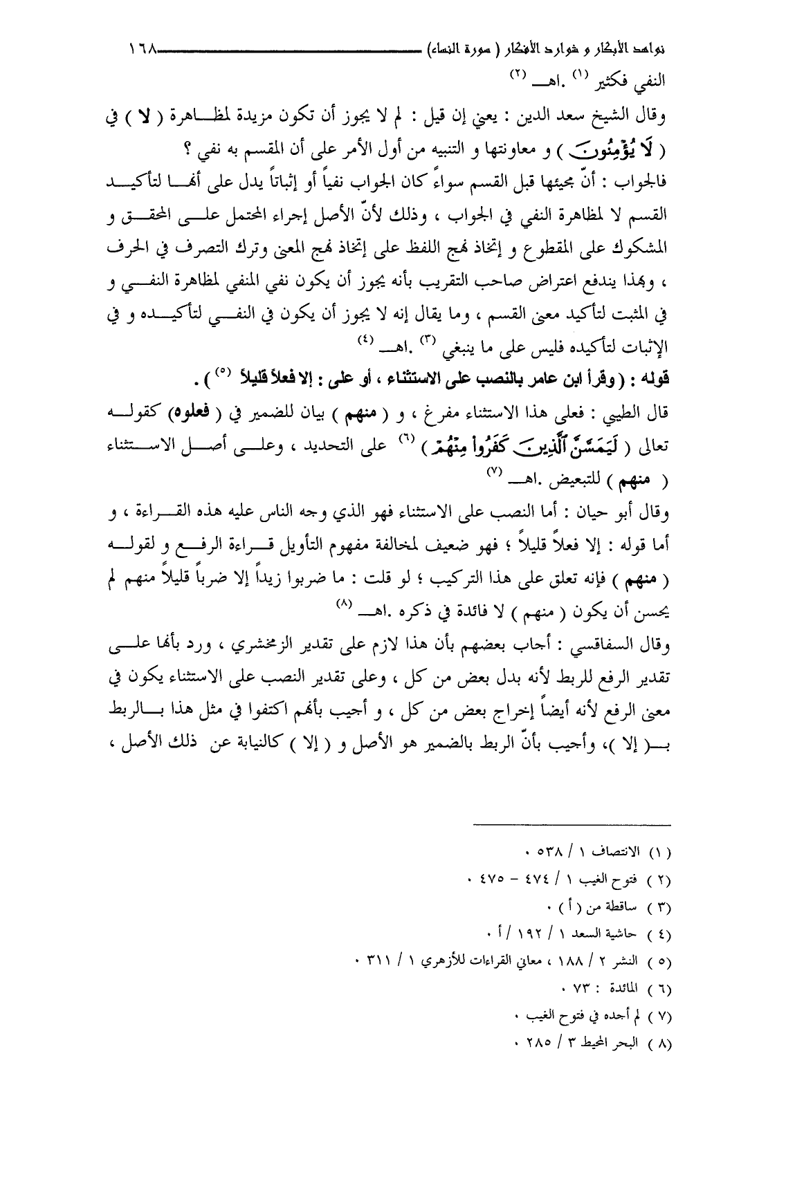 وقال أبو حيان: أما النصب على الاستثناء فهو الذي وجه الناس عليه هذه القراءة، وأما قوله: إلا فعلاً قليلاً؛ فهو ضعيف لمخالفة مفهوم التأويل قراءة الرفع ولقوله (منهم) فإنه تعلق على هذا التركيب؛ لو قلت: ما ضربوا زيداً إلا ضرباً قليلاً منهم لم يحسن أن يكون (منهم) لا فائدة في ذكره. اهـ