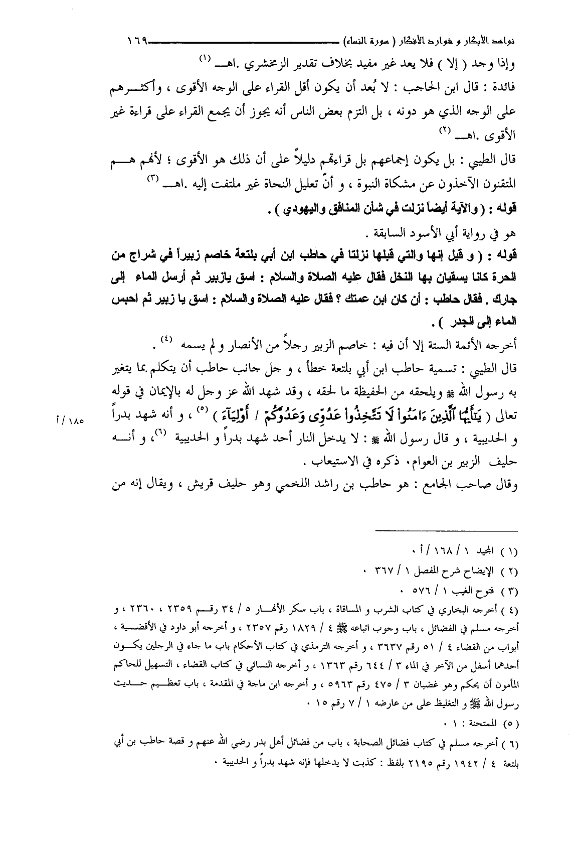 قوله: (وقيل إنها والتى قبلها نزلتا فى حاطب ابن أبى بلتعة خاصم زبيراً فى شراج من الحرة كانا يسقيان بها النخل فقال عليه الصلاة والسلام: اسق يا زبير ثم أرسل الماء إلى جارك. فقال حاطب: أن كان ابن عمتك؟ فقال عليه الصلاة والسلام: اسق يا زبير ثم احبس الماء إلى الجدر).
