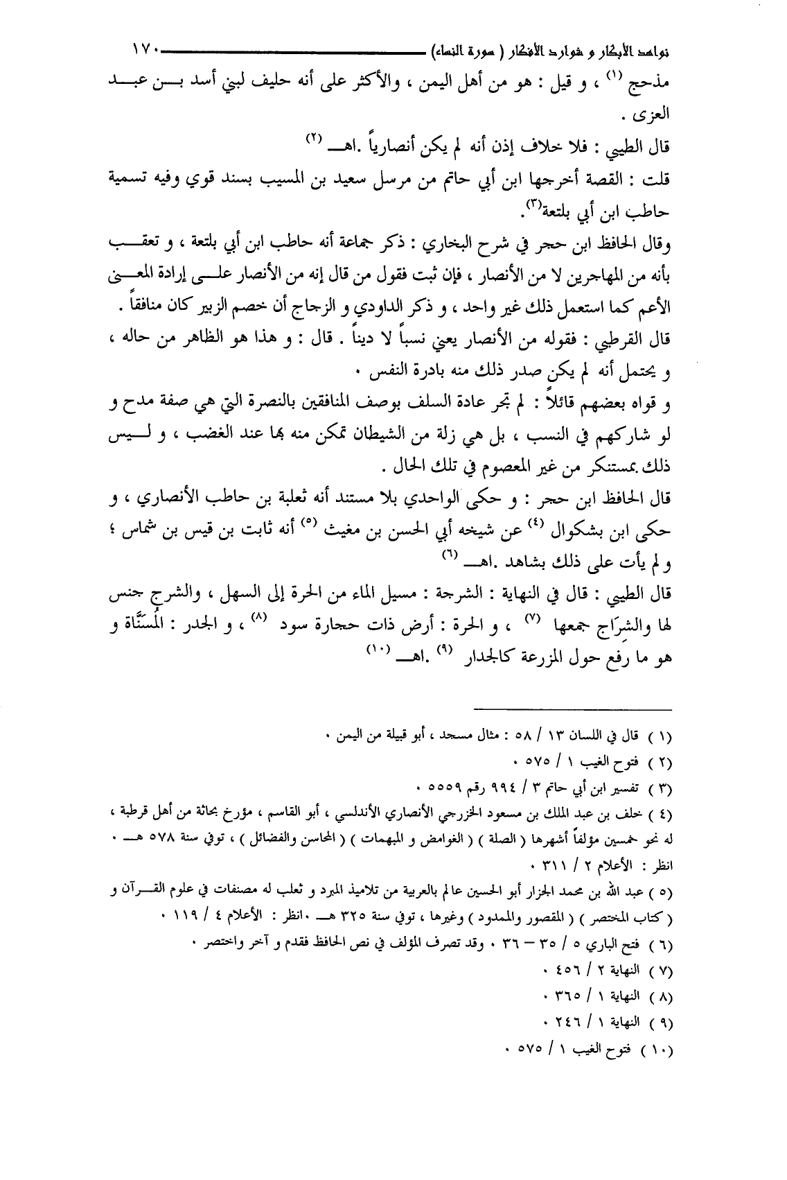 وقواه بعضهم قائلاً: لم تجر عادة السلف بوصف المنافقين بالنصرة التي هى صفة مدح ولو شاركهم في النسب، بل هي زلة من الشيطان تمكن منه بها عند الغضب، وليس ذلك بمستنكر من غير المعصوم في تلك الحال.