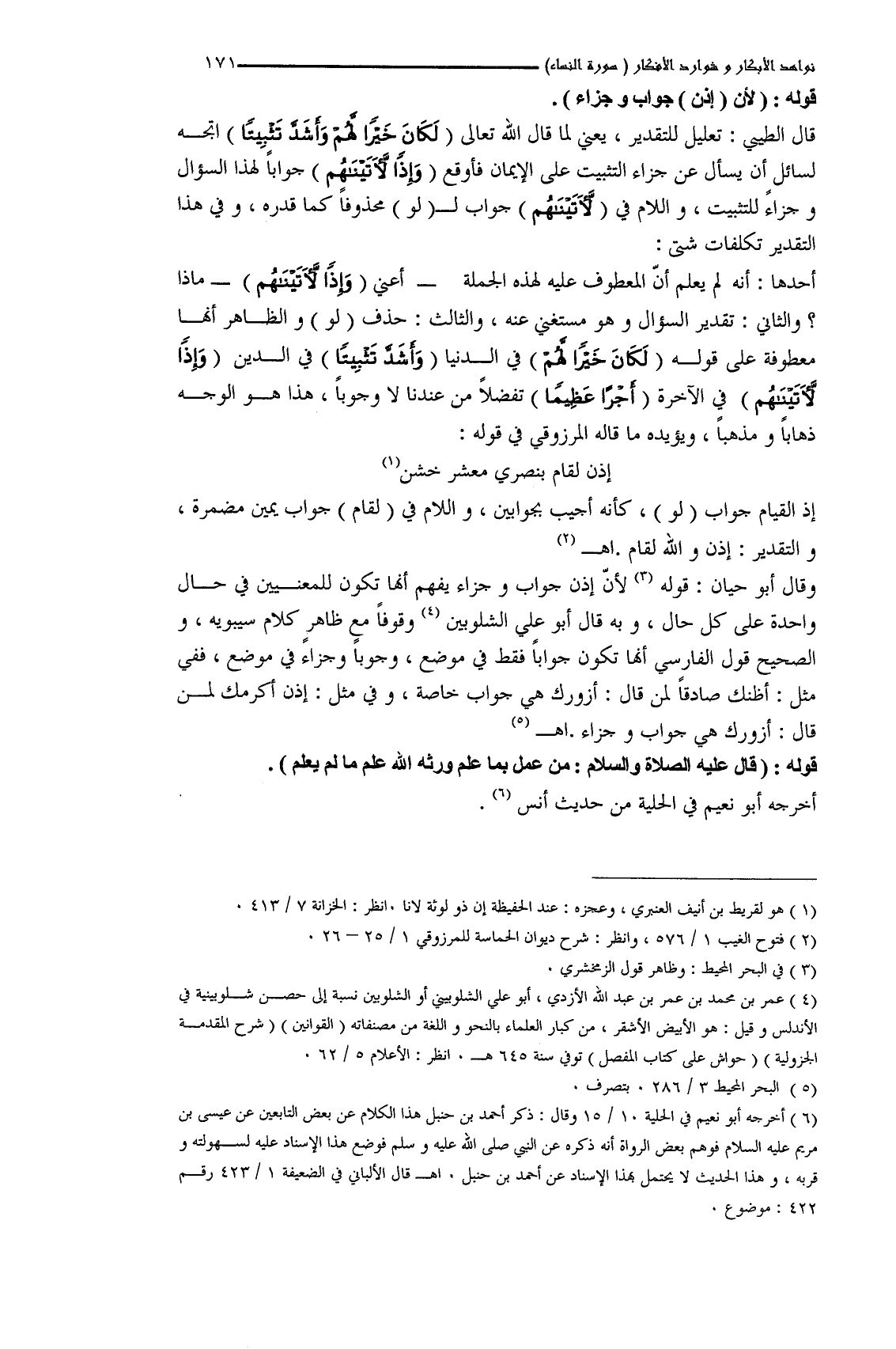 أحدها: أنه لم يعلم أنَّ المعطوف عليه لهذه الجملة -أعني (وَإِذًا لَآتَيْنَاهُمْ) - ماذا؟ والثاني: تقدير السؤال وهو مستغني عنه، والثالث: حذف (لو) والظاهر أنها معطوفة على قوله (لَكَانَ خَيْرًا لَهُمْ) في الدنيا (وَأَشَدَّ تَثْبِيتًا) في الدين (وَإِذًا لَآتَيْنَاهُمْ) في الآخرة (أَجْرًا عَظِيمًا) تفضلاً من عندنا لا وجوباً، هذا هو الوجه ذهاباً ومذهباً، ويؤيده ما قاله المرزوقي في قوله: