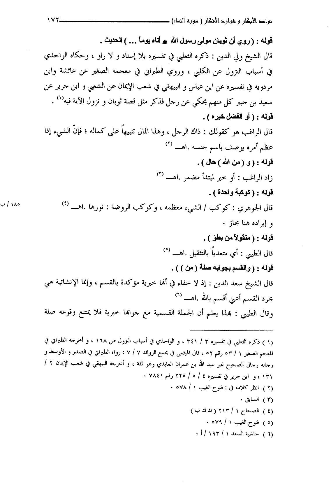 قال الشيخ ولي الدين: ذكره الثعلبي في تفسيره بلا إسناد ولا راو، وحكاه الواحدي في أسباب النزول عن الكلبي، وروي الطبراني في معجمه الصغير عن عائشة وابن مردويه في تفسيره عن ابن عباس والبيهقي في شعب الإيمان عن الشعبي وابن جرير عن سعيد بن جبير كل منهم يحكي عن رجل فذكر مثل قصة ثوبان ونزول الآية فيه.