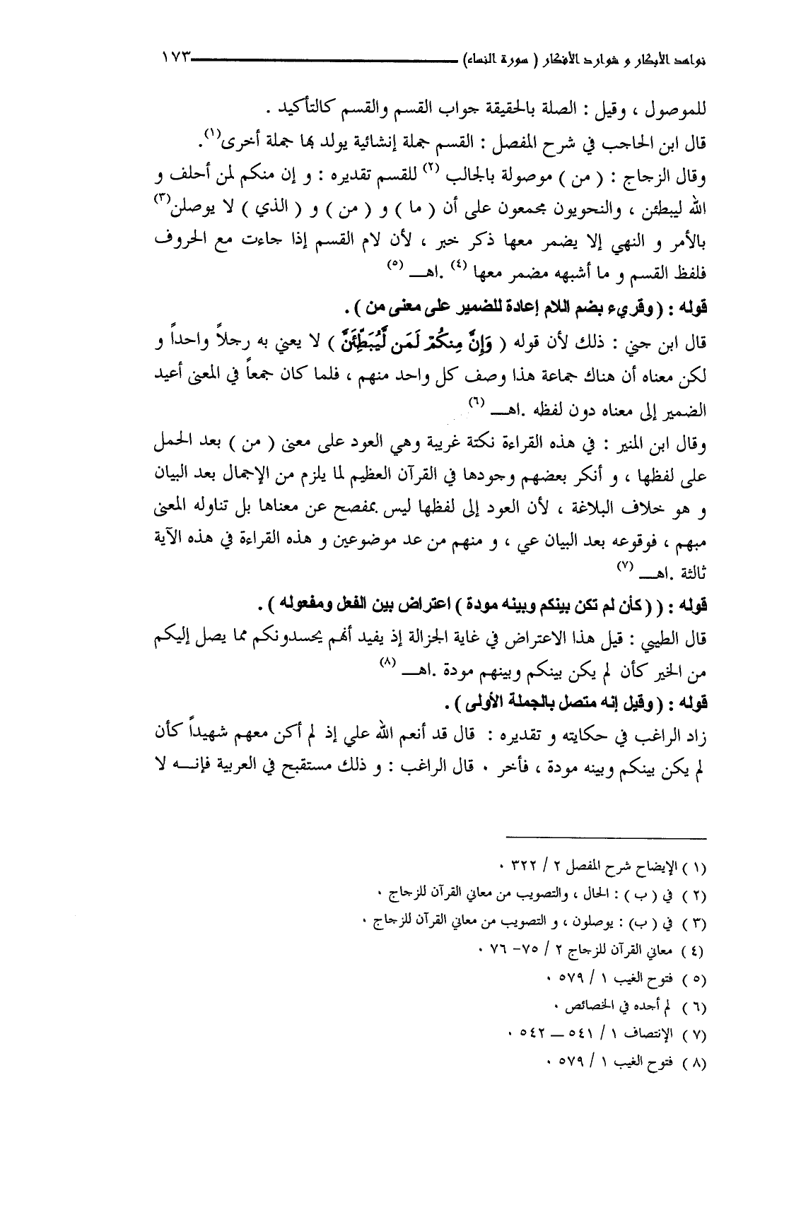 وقال الزجاج: (من) موصولة بالجالب للقسم تقديره: وإن منكم لمن أحلف والله ليبطئن، والنحويون مجمعون على أن (ما) و (من) و (الذي) لا يوصلن بالأمر والنهى إلا يضمر معها ذكر خبر، لأن لام القسم إذا جاءت مع الحروف فلفظ القسم وما أشبهه مضمر معها. اهـ