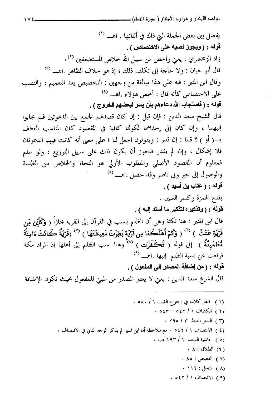 قال ابن المنير: هنا نكتة وهي أن الظلم ينسب في القرآن إلى القرية مجازاً (وَكَأَيِّنْ مِنْ قَرْيَةٍ عَتَتْ) (وَكَمْ أَهْلَكْنَا مِنْ قَرْيَةٍ بَطِرَتْ مَعِيشَتَهَا) (قَرْيَةً كَانَتْ آمِنَةً مُطْمَئِنَّةً) إلى قوله (فَكفَرَتْ) وهنا نسب الظلم إلى أهلها إذ المراد مكة فرفعت عن نسبة الظلم إليها. اهـ