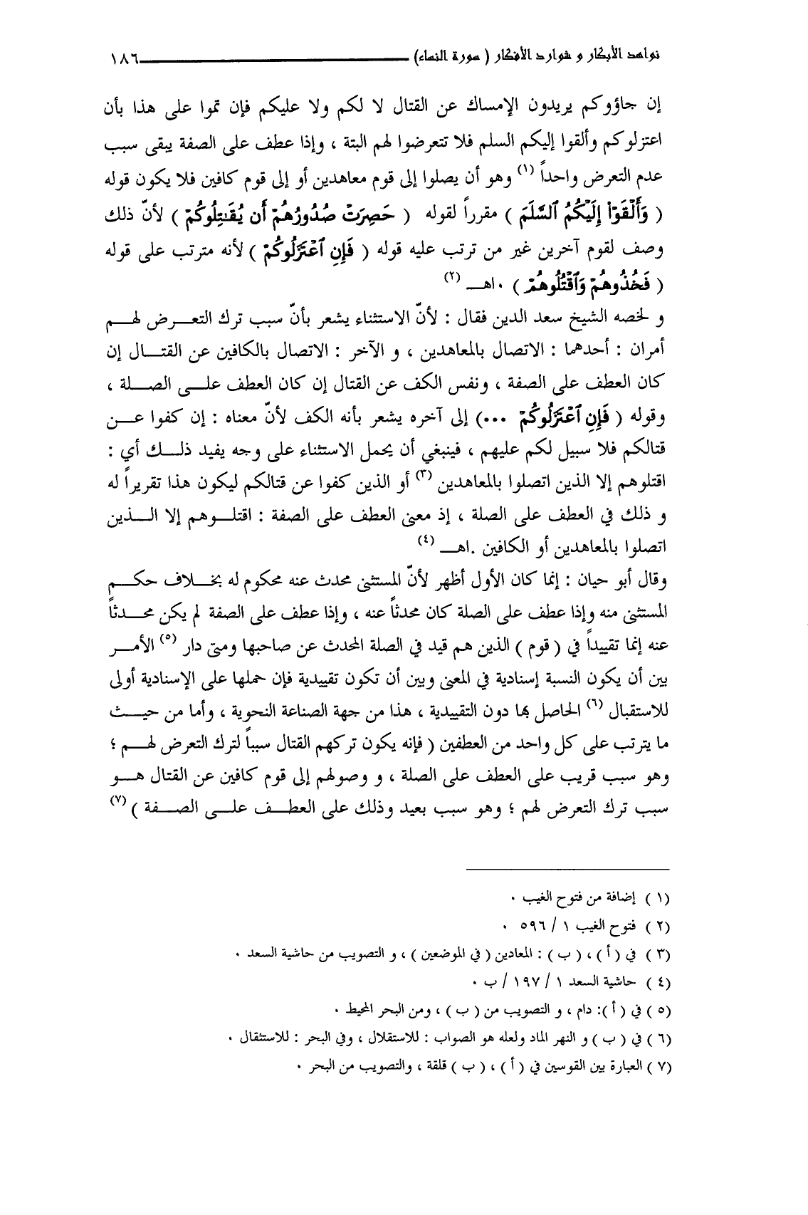 ولخصه الشيخ سعد الدين فقال: لأنَّ الاستثناء يشعر بأنَّ سبب ترك التعرض لهم أمران: أحدهما: الاتصال بالمعاهدين، والآخر: الاتصال بالكافين عن القتال إن كان العطف على الصفة، ونفس الكف عن القتال إن كان العطف على الصلة، وقوله (فَإِنِ اعْتَزَلُوكُمْ ... ) إلى آخره يشعر بأنه الكف لأنَّ معناه: إن كفوا عن قتالكم فلا سبيل لكم عليهم، فينبغي أن يحمل الاستثناء على وجه يفيد ذلك أي: اقتلوهم إلا الذين اتصلوا بالمعاهدين أو الذين كفوا عن قتالكم ليكون هذا تقريراً له وذلك في العطف على الصلة، إذ معنى العطف على الصفة: اقتلوهم إلا الذين اتصلوا بالمعاهدين أو الكافين. اهـ