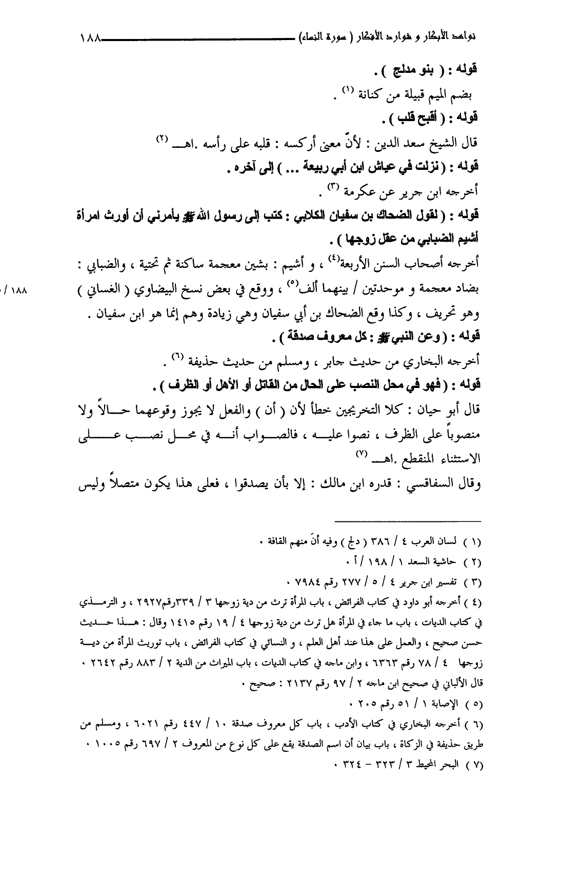 قوله: (لقول الضحاك بن سفيان الكلابي: كتب إليَّ رسول الله - صلى الله عليه وسلم - يأمرني أن أورث امرأة أشْيم الضبابى من عقل زوجها).