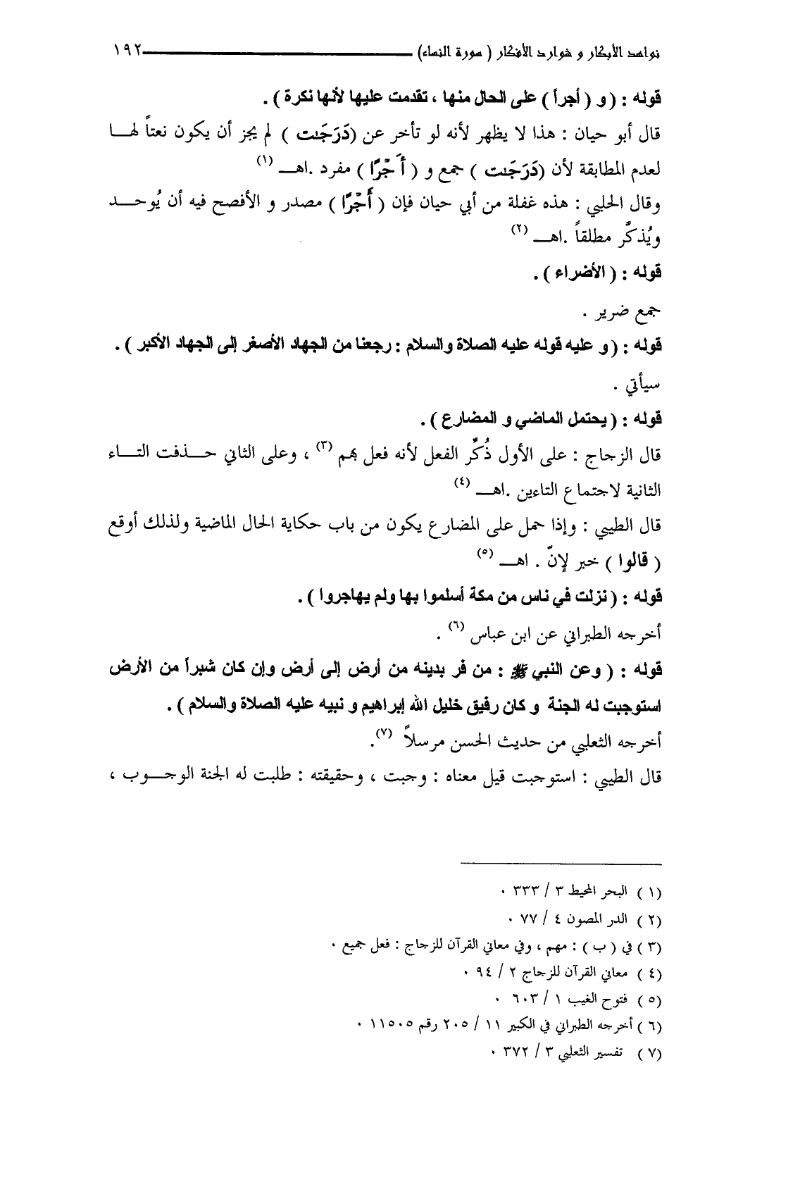 قال أبو حيان: هذا لا يظهر لأنه لو تأخر عن (دَرَجَاتٍ) لم يجز أن يكون نعتاً لها لعدم المطابقة لأن (دَرَجَاتٍ) جمع و (أَجْرًا) مفرد. اهـ