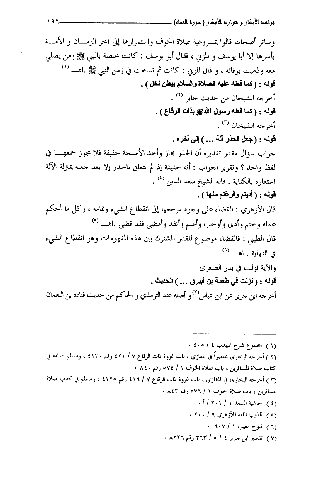 وسائر أصحابنا قالوا بمشروعية صلاة الخوف واستمرارها إلى آخر الزمان والأمة بأسرها إلا أبا يوسف والمزني، فقال أبو يوسف: كانت مختصة بالنبي - صلى الله عليه وسلم - ومن يصلي معه وذهبت بوفاته، وقال المزني: كانت ثم نُسخت في زمن النبي - صلى الله عليه وسلم -. اهـ