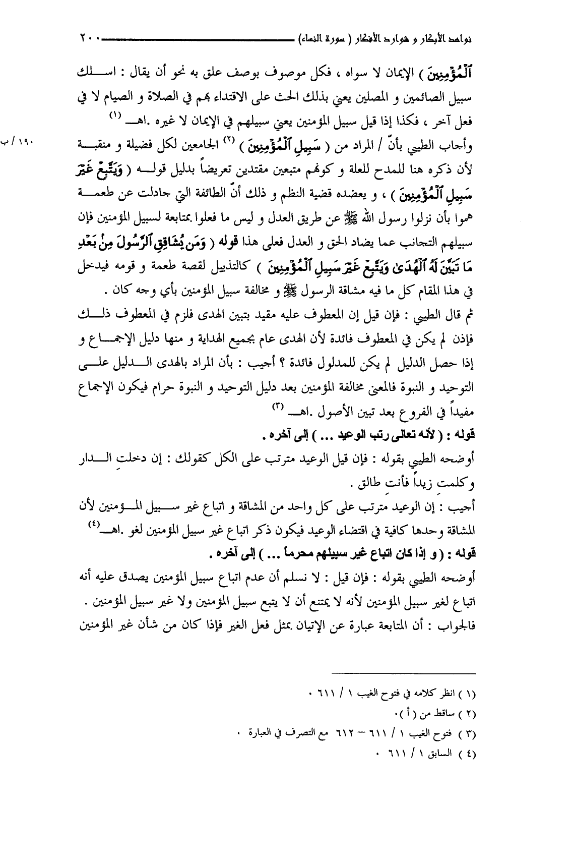 وأجاب الطَّيبي بأنَّ المراد من (سَبِيلِ الْمُؤْمِنِينَ) الجامعين لكل فضيلة ومنقبة لأن ذكره هنا للمدح للعلة وكونهم متبعين مقتدين تعريضاً بدليل قوله (وَيَتَّبِعْ غَيْرَ سَبِيلِ الْمُؤْمِنِينَ)، ويعضده قضية النظم وذلك أنَّ الطائفة التي جادلت عن طعمة هموا بأن نزلوا رسول الله - صلى الله عليه وسلم - عن طريق العدل وليس ما فعلوا بمتابعة لسبيل المؤمنين فإن سبيلهم التجانب عما يضاد الحق والعدل فعلى هذا قوله (وَمَنْ يُشَاقِقِ الرَّسُولَ مِنْ بَعْدِ مَا تَبَيَّنَ لَهُ الْهُدَى وَيَتَّبِعْ غَيْرَ سَبِيلِ الْمُؤْمِنِينَ) كالتذييل لقصة طعمة وقومه فيدخل في هذا المقام كل ما فيه مشاقة الرسول - صلى الله عليه وسلم - ومخالفة سبيل المؤمنين بأي وجه كان.
