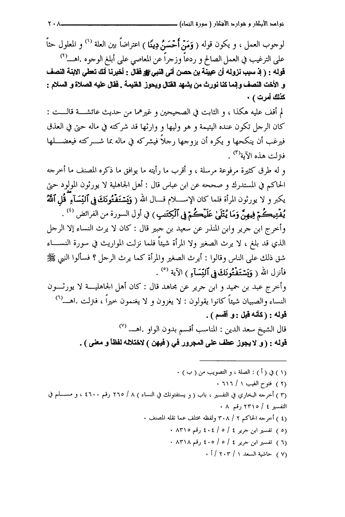 قوله: (إذ سبب نزوله أن عيينة بن حصن أتى النبي - صلى الله عليه وسلم - فقال: أخبرنا أنك تعطى الابنة النصف والأخت النصف وإنما كنا نورث من يشهد القتال ويحوز الغنيمة. فقال عليه الصلاة والسلام: كذلك أُمرت).