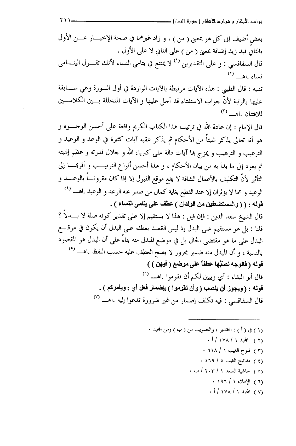 قوله: ((وَالْمُسْتَضْعَفِينَ مِنَ الْوِلْدَانِ) عطف على يتامى النساء).