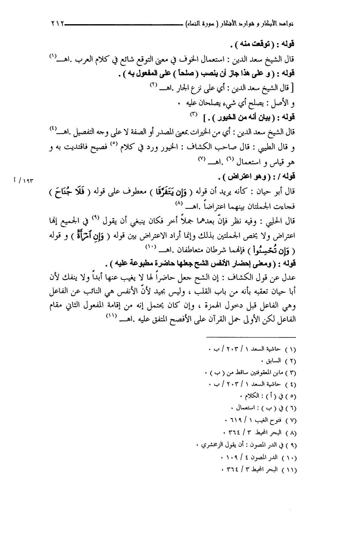 قال الحلبي: وفيه نظر فإنَّ بعدهما جملاً أُخر فكان ينبغي أن يقول في الجميع إنها اعتراض ولا يخص الجملتين بذلك وإنما أراد الاعتراض بين قوله (وَإِنِ امْرَأَةٌ) وقوله (وَإِنْ تُحْسِنُوا) فإنهما شرطان متعاطفان. اهـ