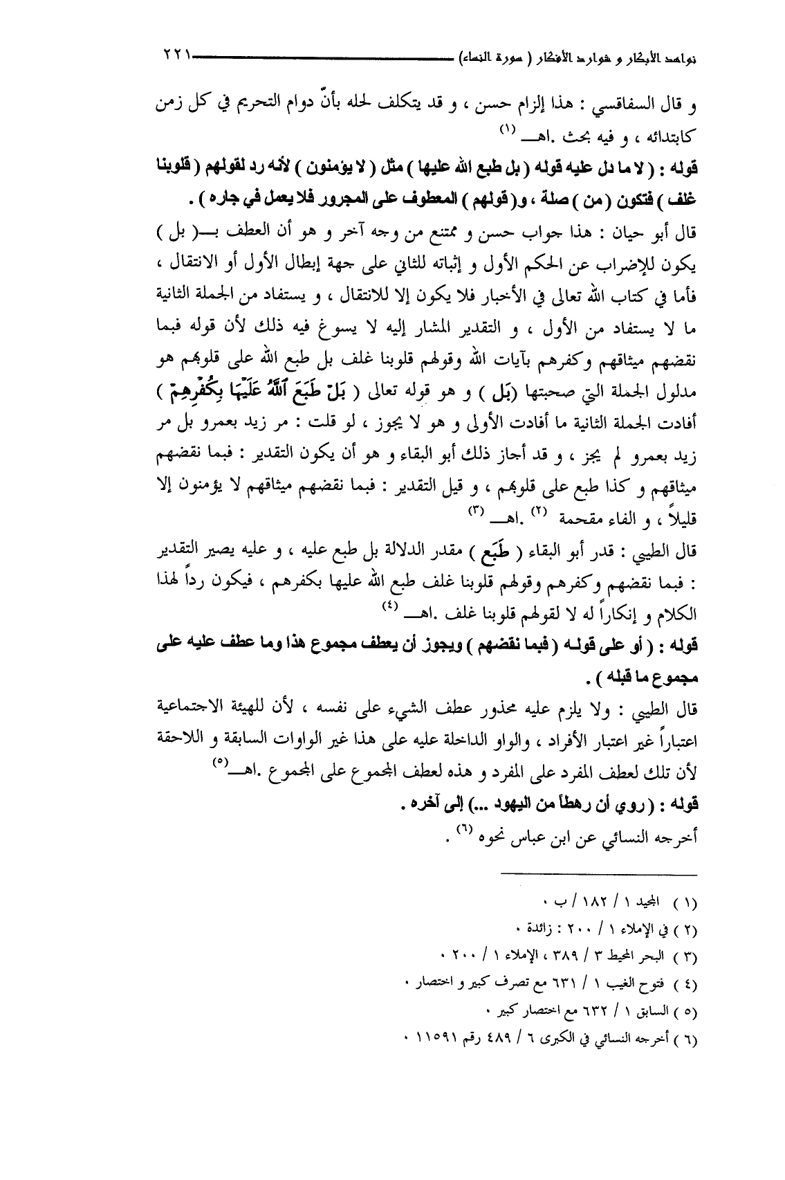 قال أبو حيان: هذا جواب حسن وممتنع من وجه آخر وهو أن العطف بـ (بل) يكون للإضراب عن الحكم الأول وإثباته للثاني على جهة إبطال الأول أو الانتقال، فأما في كتاب الله تعالى في الأخبار فلا يكون إلا للانتقال، ويستفاد من الجملة الثانية ما لا يستفاد من الأول، والتقدير المشار إليه لا يسوغ فيه ذلك لأن قوله فبما نقضهم ميثاقهم وكفرهم بآيات الله وقولهم قلوبنا غلف بل طبع الله على قلوبهم هو مدلول الجملة التي صحبتها (بَل) وهو قوله تعالى (بَلْ طَبَعَ اللهُ عَلَيْهَا بِكُفْرِهِمْ) أفادت الجملة الثانية ما أفادت الأولى وهو لا يجوز، لو قلت: مر زيد بعمرو بل مر زيد بعمرو لم يجز، وقد أجاز ذلك أبو البقاء وهو أن يكون التقدير: فبما نقضهم ميثاقهم وكذا طبع على قلوبهم، وقيل التقدير: فبما نقضهم ميثاقهم لا يؤمنون إلا قليلاً، والفاء مقحمة. اهـ