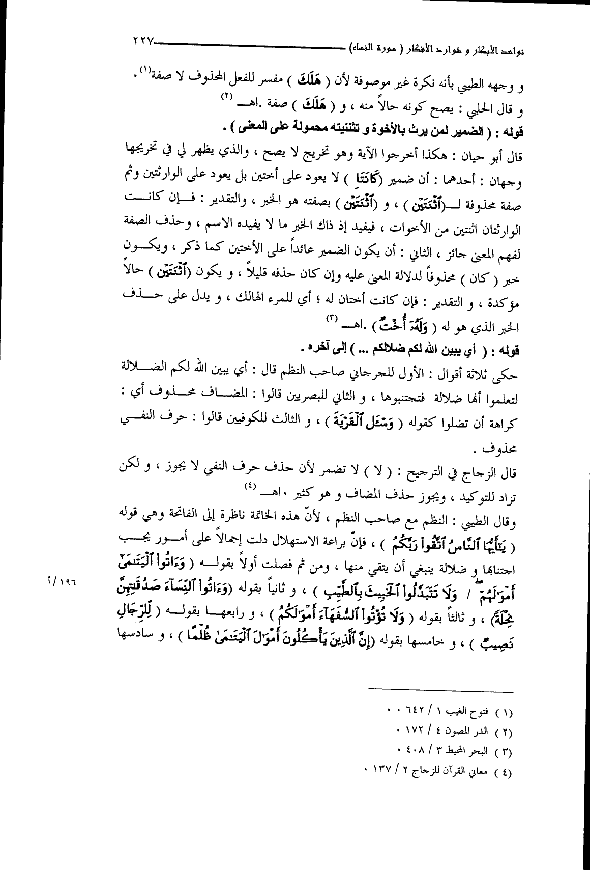 قال أبو حيان: هكذا أخرجوا الآية وهو تخريج لا يصح، والذي يظهر لي في تخريجها وجهان: أحدهما: أن ضمير (كَانَتَا) لا يعود على أختين بل يعود على الوارثتين وثم صفة محذوفة لـ (اثْنَتَيْنِ)، و (اثْنَتَيْنِ) بصفته هو الخبر، والتقدير: فإن كانت الوارثتان اثنتين من الأخوات، فيفيد إذ ذاك الخبر ما لا يفيده الاسم، وحذف الصفة لفهم المعنى جائز، الثاني: أن يكون الضمير عائداً على الأختين كما ذكر، ويكون خبر (كان) محذوفاً لدلالة المعنى عليه وإن كان حذفه قليلاً، ويكون (اثْنَتَيْنِ) حالاً مؤكدة، والتقدير: فإن كانت أختان له؛ أي للمرء الهالك، ويدل على حذف الخبر الذي هو له (وَلَهُ أُخْتٌ). اهـ