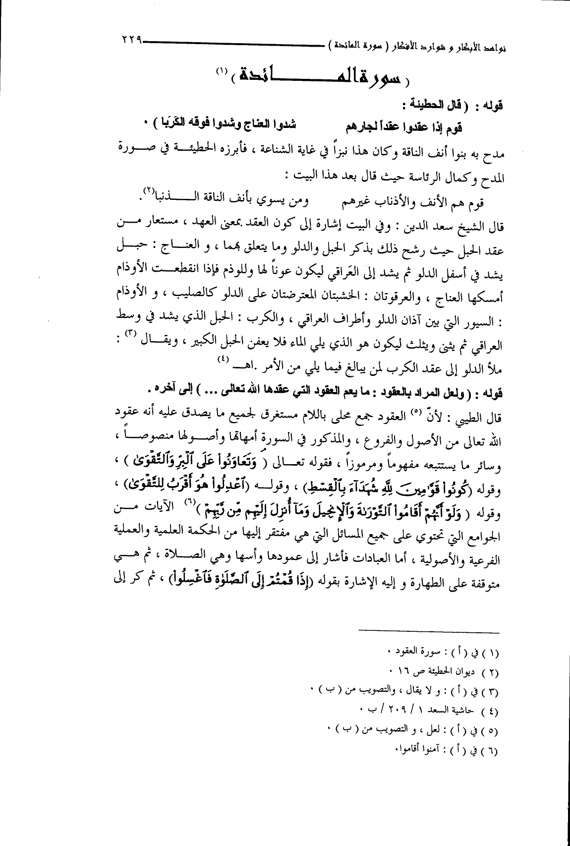 قال الطَّيبي: لأنَّ العقود جمع محلى باللام مستغرق لجميع ما يصدق عليه أنه عقود الله تعالى من الأصول والفروع، والمذكور في السورة أمهاتها وأصولها منصوصاً، وسائر ما يستتبعه مفهوماً ومرموزاً، فقوله تعالى (وَتَعَاوَنُوا عَلَى الْبِرِّ وَالتَّقْوَى)، وقوله (كُونُوا قَوَّامِينَ لِلَّهِ شُهَدَاءَ بِالْقِسْطِ)، وقوله (اعْدِلُوا هُوَ أَقْرَبُ لِلتَّقْوَى)، وقوله (وَلَوْ أَنَّهُمْ أَقَامُوا التَّوْرَاةَ وَالْإِنْجِيلَ وَمَا أُنْزِلَ إِلَيْهِمْ مِنْ رَبِّهِمْ) الآيات من الجوامع التي تحتوي على جميع المسائل التي هي مفتقر إليها من الحكمة العلمية والعملية الفرعية والأصولية، أما العبادات فأشار إلى عمودها وأسها وهي الصلاة، ثم هي متوقفة على الطهارة وإليه الإشارة بقوله (إِذَا قُمْتُمْ إِلَى الصَّلاةِ فَاغْسِلُوا)، ثم كر إلى