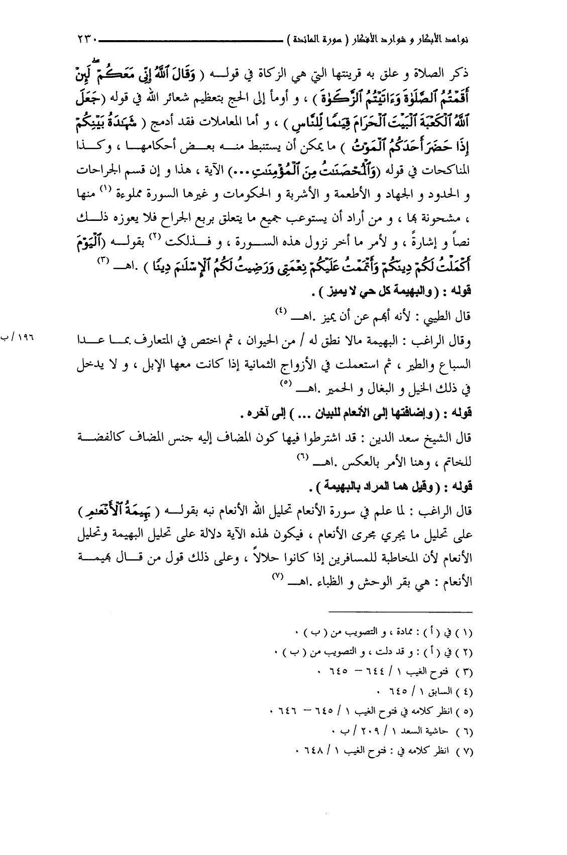 قال الراغب: لما علم في سورة الأنعام تحليل الله الأنعام نبه بقوله (بَهِيمَةُ الْأَنْعَامِ) على تحليل ما يجري مجرى الأنعام، فيكون لهذه الآية دلالة على تحليل البهيمة وتحليل الأنعام لأن المخاطبة للمسافرين إذا كانوا حلالاً، وعلى ذلك قول من قال بَهِيمَةُ الْأَنْعَامِ: هي بقر الوحش والظباء. اهـ