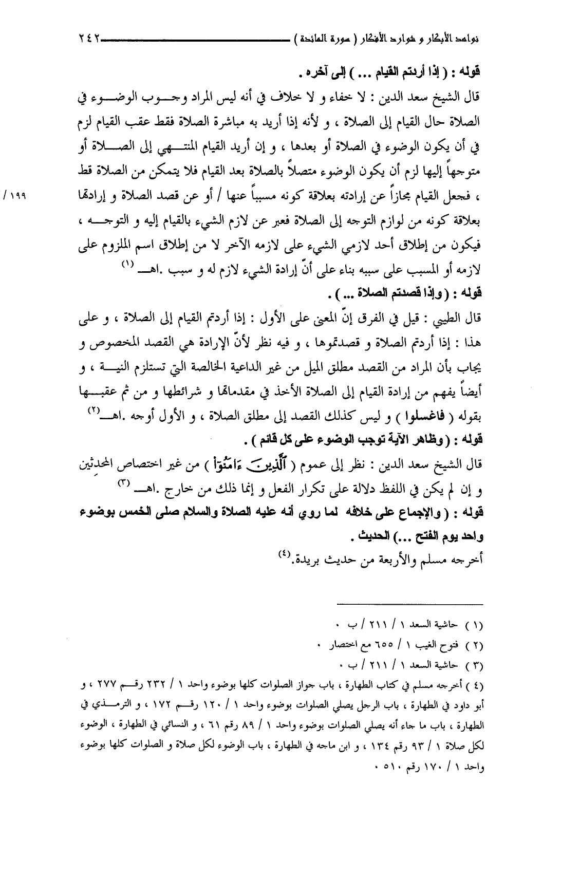 قال الشيخ سعد الدين: لا خفاء ولا خلاف في أنه ليس المراد وجوب الوضوء في الصلاة حال القيام إلى الصلاة، ولأنه إذا أريد به مباشرة الصلاة فقط عقب القيام لزم في أن يكون الوضوء في الصلاة أو بعدها، وإن أريد القيام المنتهي إلى الصلاة أو متوجهاً إليها لزم أن يكون الوضوء متصلاً بالصلاة بعد القيام فلا يتمكن من الصلاة قط، فجعل القيام مجازاً عن إرادته بعلاقة كونه مسبباً عنها أو عن قصد الصلاة وإرادتها بعلاقة كونه من لوازم التوجه إلى الصلاة فعبر عن لازم الشيء بالقيام إليه والتوجه، فيكون من إطلاق أحد لازمي الشيء على لازمه الآخر لا من إطلاق اسم الملزوم على لازمه أو المسبب على سببه بناء على أنَّ إرادة الشيء لازم له وسبب. اهـ