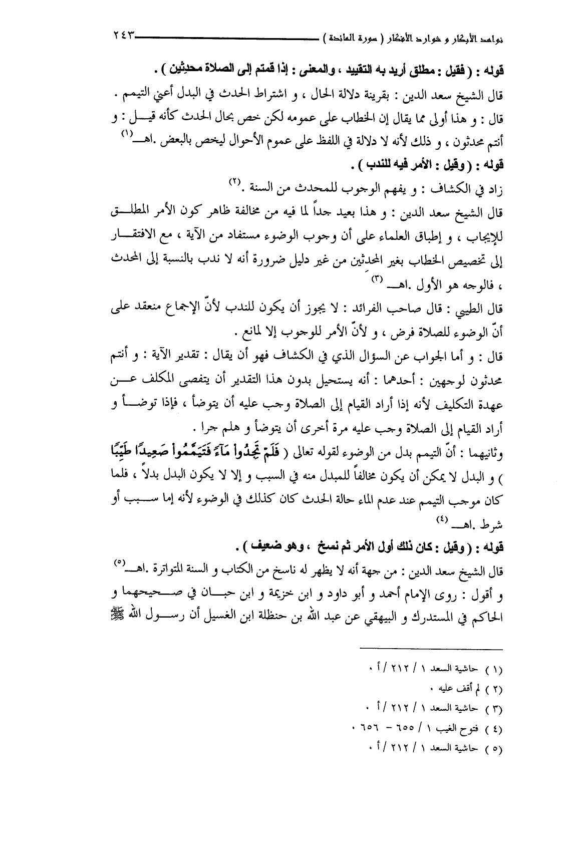 قال الشيخ سعد الدين: وهذا بعيد جداً لما فيه من مخالفة ظاهر كون الأمر المطلق للإيجاب، وإطباق العلماء على أن وجوب الوضوء مستفاد من الآية، مع الافتقار إلى تخصيص الخطاب بغير المحدِثين من غير دليل ضرورة أنه لا ندب بالنسبة إلى المحدث، فالوجه هو الأول. اهـ