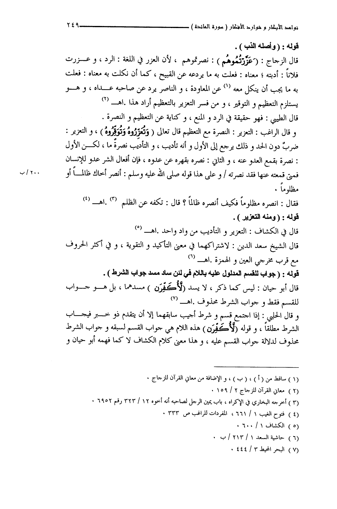 قال الزجاج: (عَزَّرْتُمُوهُم): نصرتموهم، لأن العزر في اللغة: الرد، وعزرت فلاناً: أدبته، معناه: فعلت به ما يردعه عن القبيح، كما أن نكلت به معناه: فعلت به ما يجب أن ينكل معه عن المعاودة، والناصر يرد عن صاحبه عداه، وهو يستلزم التعظيم والتوقير، ومن فسر التعزير بالتعظيم أراد هذا. اهـ