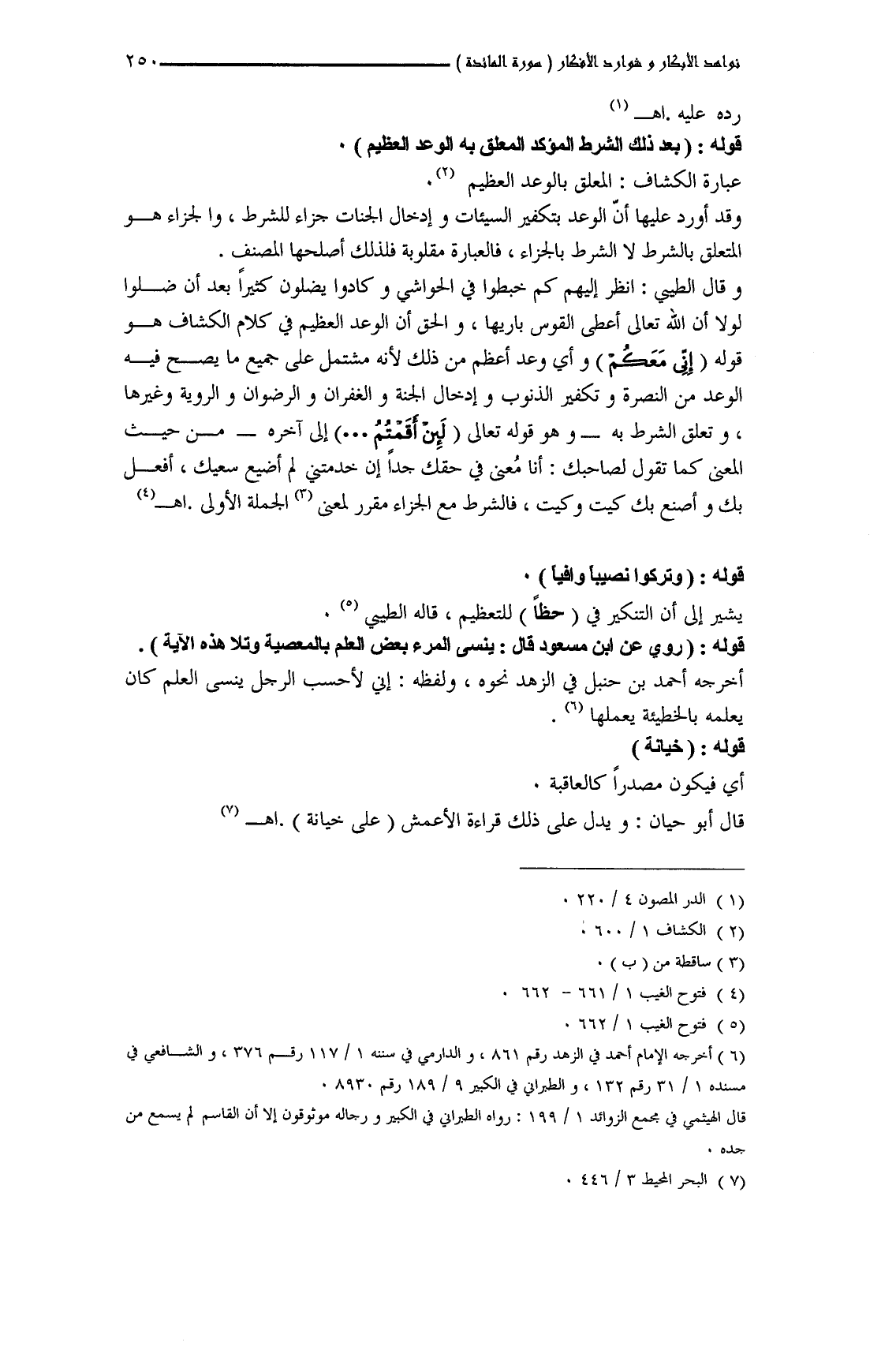 وقال الطَّيبي: انظر إليهم كم خبطوا في الحواشي وكادوا يضلون كثيراً بعد أن ضلوا لولا أن الله تعالى أعطى القوس باريها، والحق أن الوعد العظيم في كلام الكشاف هو قوله (إِنِّي مَعَكُمْ) وأي وعد أعظم من ذلك لأنه مشتمل على جميع ما يصح فيه الوعد من النصرة وتكفر الذنوب وإدخال الجنة والغفران والرضوان والروية وغيرها، وتعلق الشرط به -وهو قوله تعالى (لَئِنْ أَقَمْتُمُ ... ) إلى آخره- من حيث المعنى كما تقول لصاحبك: أنا مُعنى في حقك جداً إن خدمتني لم أضيع سعيك، أفعل بك وأصنع بك كيت وكيت، فالشرط مع الجزاء مقرر لمعنى الجملة الأولى. اهـ