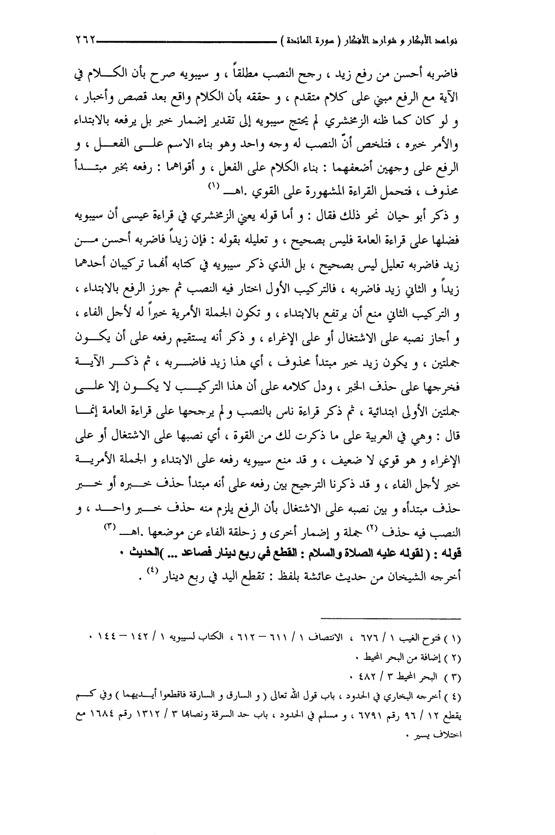 وذكر أبو حيان نحو ذلك فقال: وأما قوله يعني الزمخشري في قراءة عيسى أن سيبويه فضلها على قراءة العامة فليس بصحيح، وتعليله بقوله: فإن زيداً فاضربه أحسن من زيد فاضربه تعليل ليس بصحيح، بل الذي ذكر سيبويه في كتابه أنهما تركيبان أحدهما زيداً والثاني زيد فاضربه، فالتركيب الأول اختار فيه النصب ثم جوز الرفع بالابتداء، والتركيب الثاني منع أن يرتفع بالابتداء، وتكون الجملة الأمرية خبراً له لأجل الفاء، وأجاز نصبه على الاشتغال أو على الإغراء، وذكر أنه يستقيم رفعه على أن يكون جملتين، ويكون زيد خبر مبتدأ محذوف، أي هذا زيد فاضربه، ثم ذكر الآية فخرجها على حذف الخبر، ودل كلامه على أن هذا التركيب لا يكون إلا على جملتين الأولى ابتدائية، ثم ذكر قراءة ناس بالنصب ولم يرجحها على قراءة العامة إنما قال: وهي في العربية على ما ذكرت لك من القوة، أي نصبها على الاشتغال أو على الإغراء وهو قوي لا ضعيف، وقد منع سيبويه رفعه على الابتداء والجملة الأمرية خبر لأجل الفاء، وقد ذكرنا الترجيح بين رفعه على أنه مبتدأ حذف خبره أو خبر حذف مبتدأه وبين نصبه على الاشتغال بأن الرفع يلزم منه حذف خبر واحد، والنصب فيه حذف جملة وإضمار أخرى وزحلقة الفاء عن موضعها. اهـ