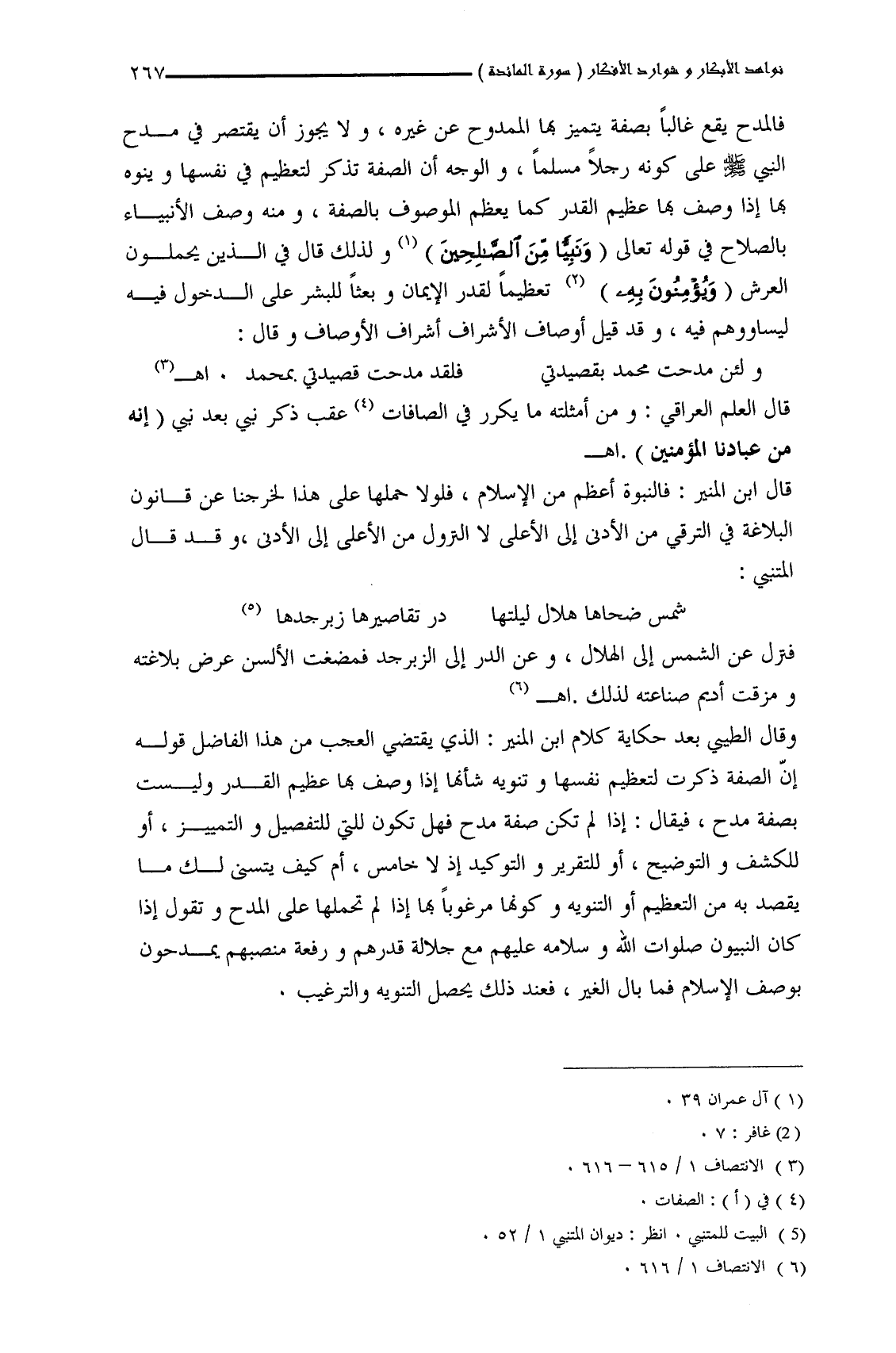 فالمدح يقع غالباً بصفة يتميز بها الممدوح عن غيره، ولا يجوز أن يقتصر في مدح النبي - صلى الله عليه وسلم - على كونه رجلاً مسلماً، والوجه أن الصفة تذكر لتعظيم في نفسها وينوه بها إذا وصف بها عظيم القدر كما يعظم الموصوف بالصفة، ومنه وصف الأنبياء بالصلاح في قوله تعالى (وَنَبِيًّا مِنَ الصَّالِحِينَ) ولذلك قال في الذين يحملون العرش (وُيؤمِنُونَ بِهِ) تعظيماً لقدر الإيمان وبعثاً للبشر على الدخول فيه ليساووهم فيه، وقد قيل أوصاف الأشراف أشراف الأوصاف وقال: