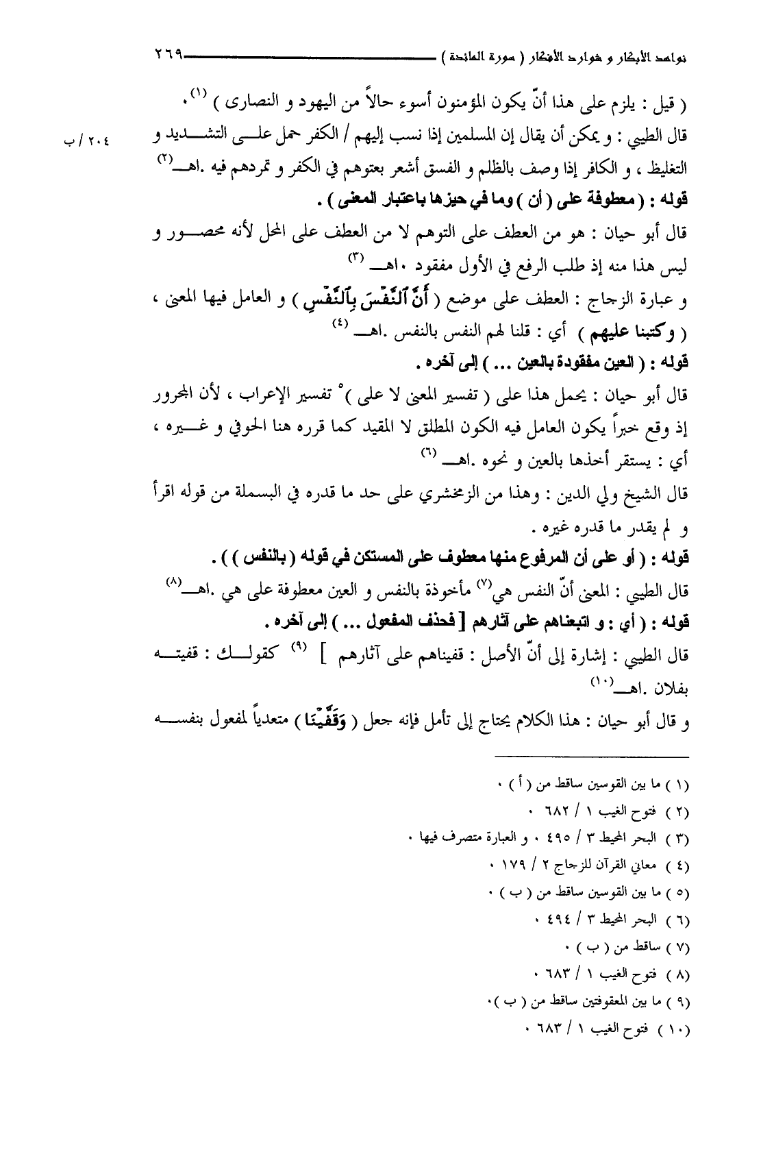 قوله: (أو على أن المرفوع منها معطوف على المستكن فى قوله (بِالنَّفْسِ)).
