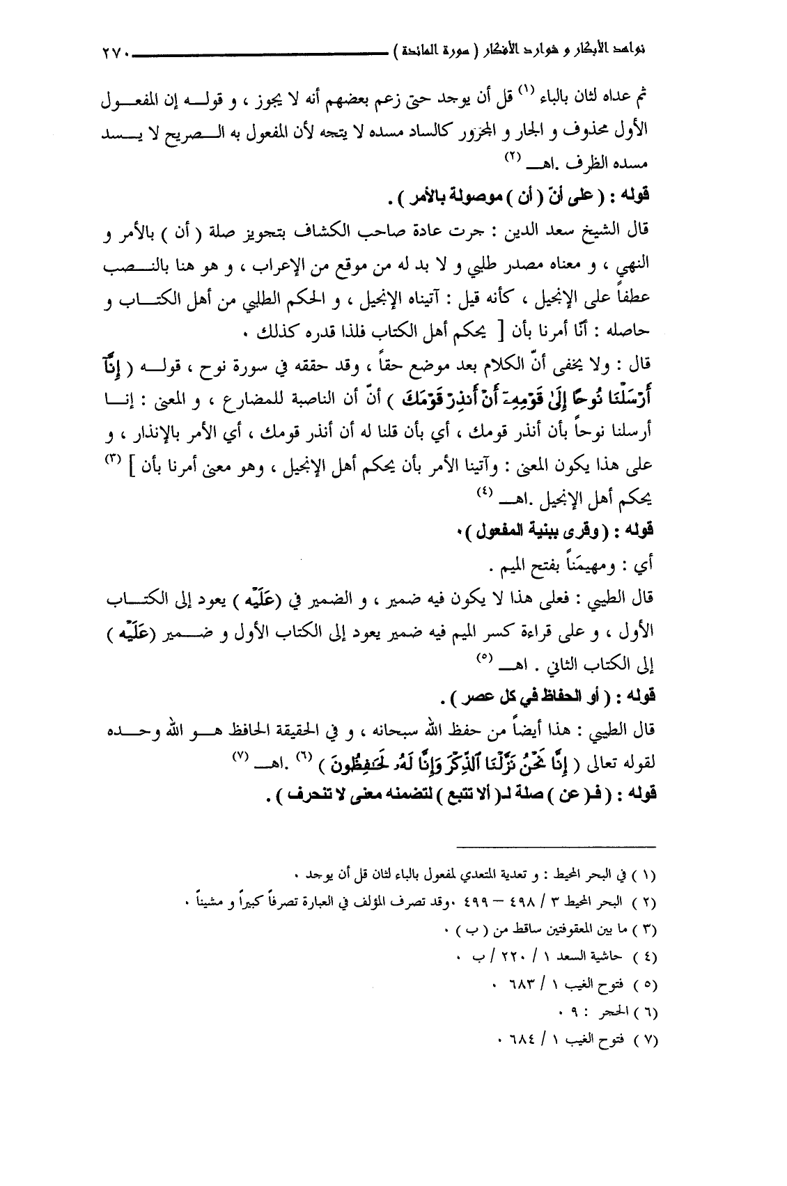 قال: ولا يخفى أنَّ الكلام بعد موضع حقاً، وقد حققه في سورة نوح، قوله (إِنَّا أَرْسَلْنَا نُوحًا إِلَى قَوْمِهِ أَنْ أَنْذِرْ قَوْمَكَ) أنَّ أن الناصبة للمضارع، والمعنى: إِنَّا أَرْسَلْنَا نُوحًا بأَنْ أَنْذِرْ قَوْمَكَ، أي بأن قلنا له أن أنذر قومك، أي الأمر بالإنذار، وعلى هذا يكون المعنى: وآتينا الأمر بأن يحكم أهل الإنجيل، وهو معنى أمرنا بأن] يحكم أهل الإنجيل. اهـ