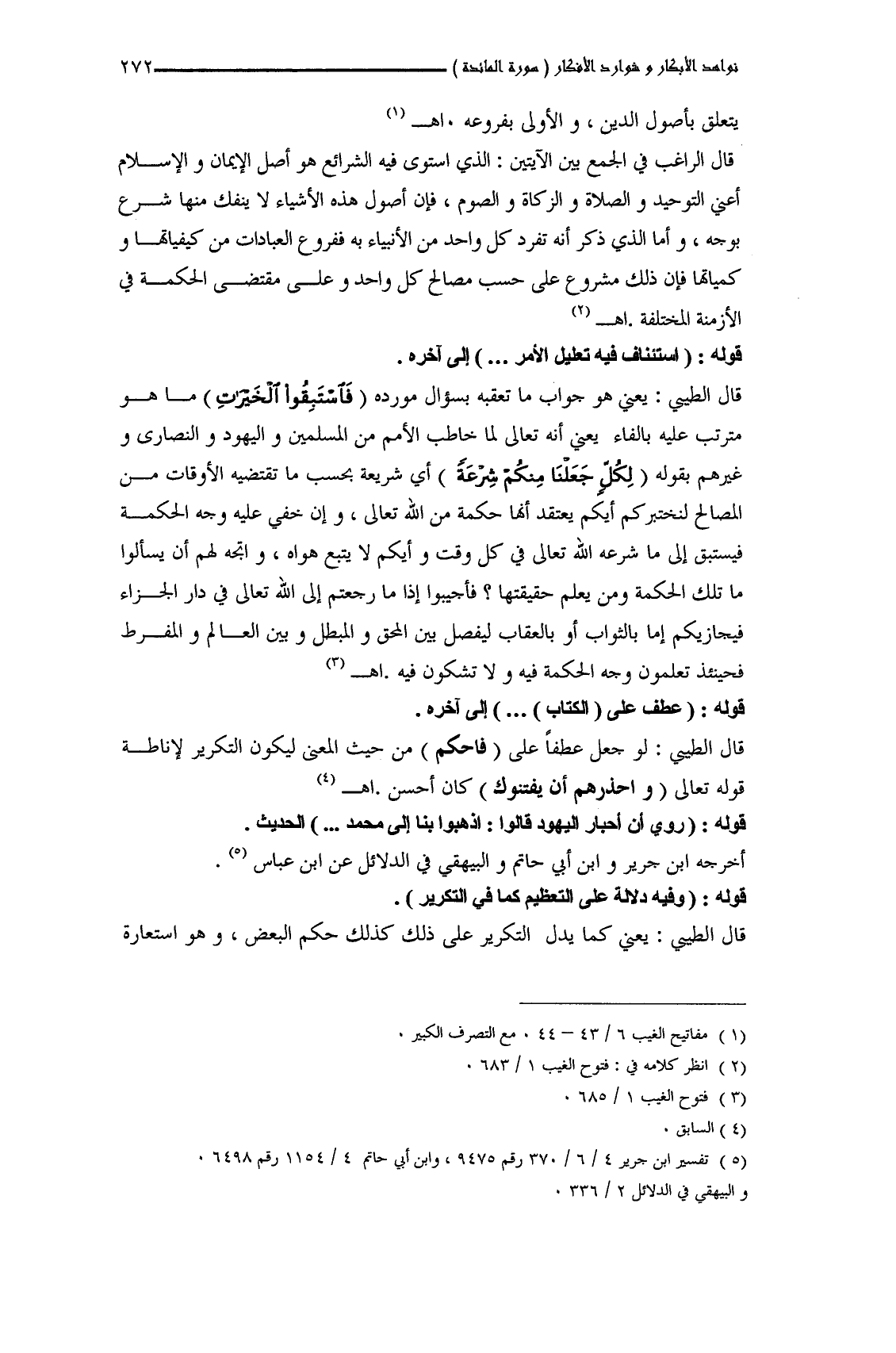 قال الطَّيبي: يعني هو جواب ما تعقبه بسؤال مورده (فَاسْتَبِقُوا الْخَيْرَاتِ) ما هو مترتب عليه بالفاء يعني أنه تعالى لما خاطب الأمم من المسلمين واليهود والنصارى وغيرهم بقوله (لِكُلٍّ جَعَلْنَا مِنْكُمْ شِرْعَةً) أي شريعة بحسب ما تقتضيه الأوقات من المصالح لنختبركم أيكم يعتقد أنَّها حكمة من الله تعالى، وإن خفي عليه وجه الحكمة فيستبق إلى ما شرعه الله تعالى في كل وقت وأيكم لا يتبع هواه، واتجه لهم أن يسألوا ما تلك الحكمة ومن يعلم حقيقتها؟ فأجيبوا إذا ما رجعتم إلى الله تعالى في دار الجزاء فيجازيكم إما بالثواب أو بالعقاب ليفصل بين المحق والمبطل وبين العالم والمفرط فحينئذ تعلمون وجه الحكمة فيه ولا تشكون فيه. اهـ